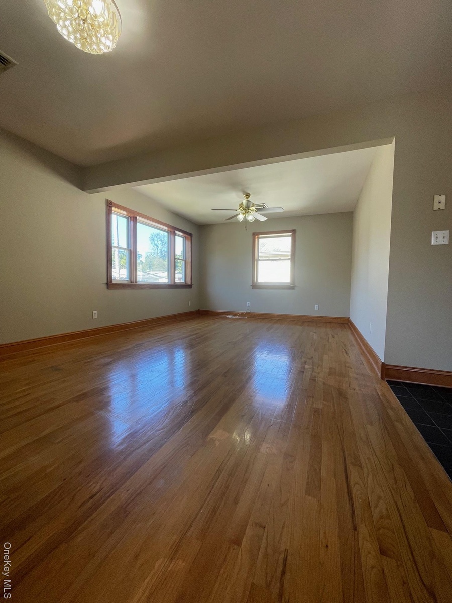 - Unfurnished living room with dark wood-type flooring and a ceiling fan