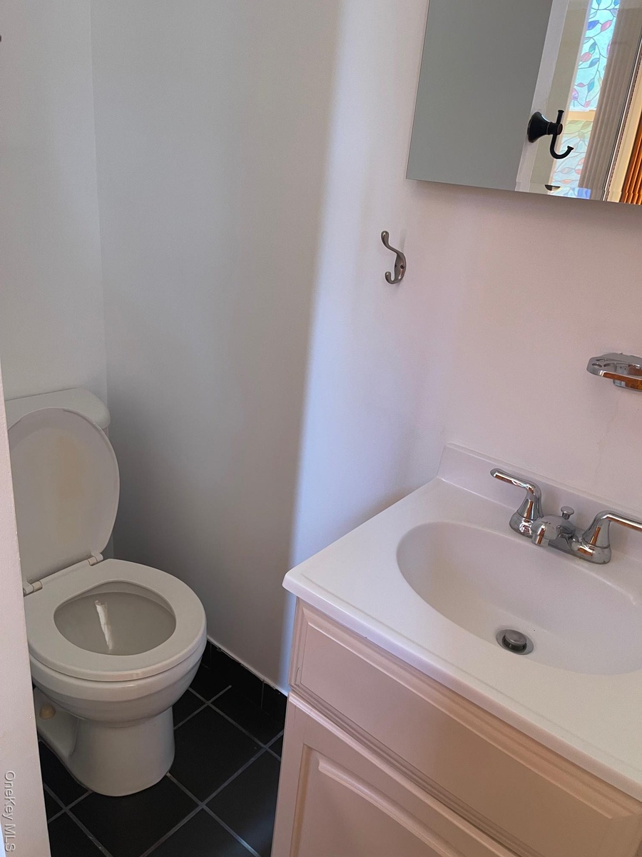 - Empty room featuring dark tile patterned flooring and a chandelier