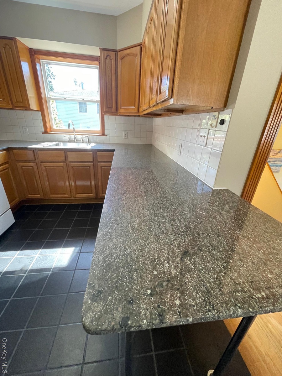 - Kitchen featuring brown cabinets, backsplash, dark tile patterned flooring, and a peninsula