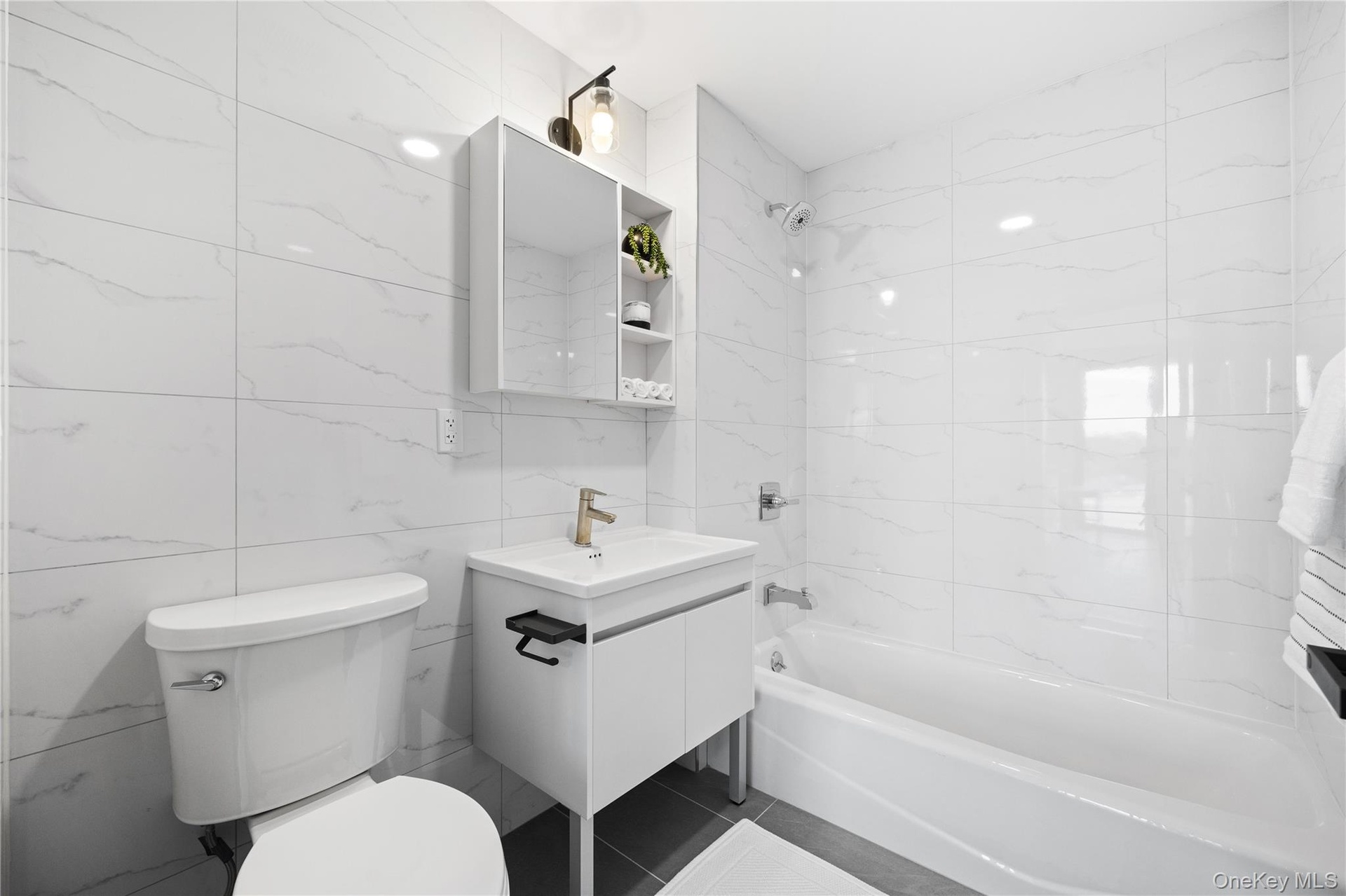 - Full bathroom with bathing tub / shower combination, vanity, and tile walls