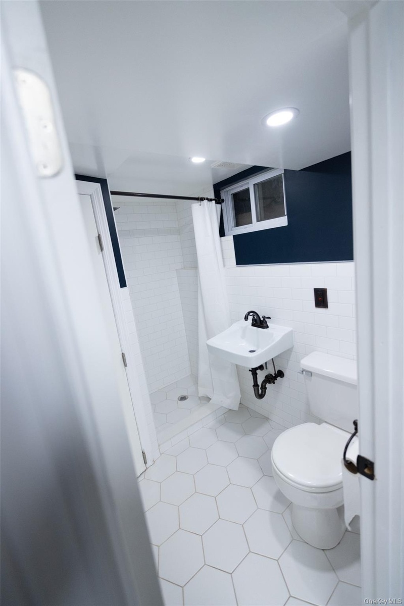 - Full bath with a shower stall, tile walls, light tile patterned floors, recessed lighting, and a wainscoted wall