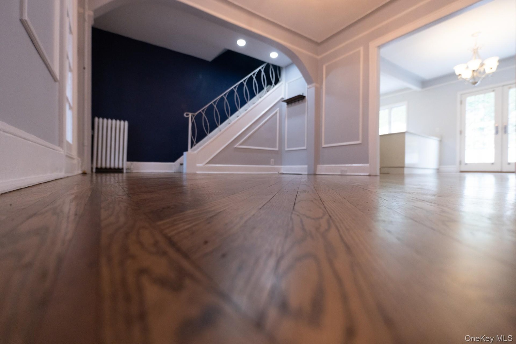 - Unfurnished living room featuring radiator, a decorative wall, wood finished floors, a chandelier, and stairway