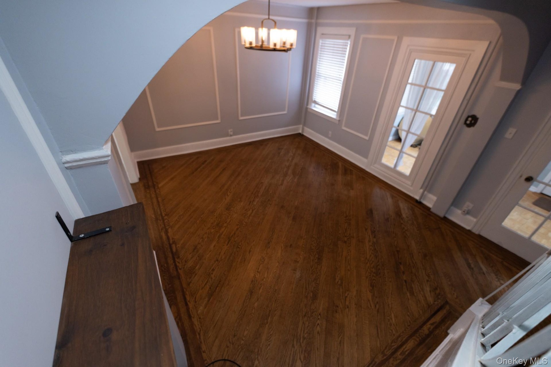 - Unfurnished dining area featuring dark wood-type flooring and a chandelier