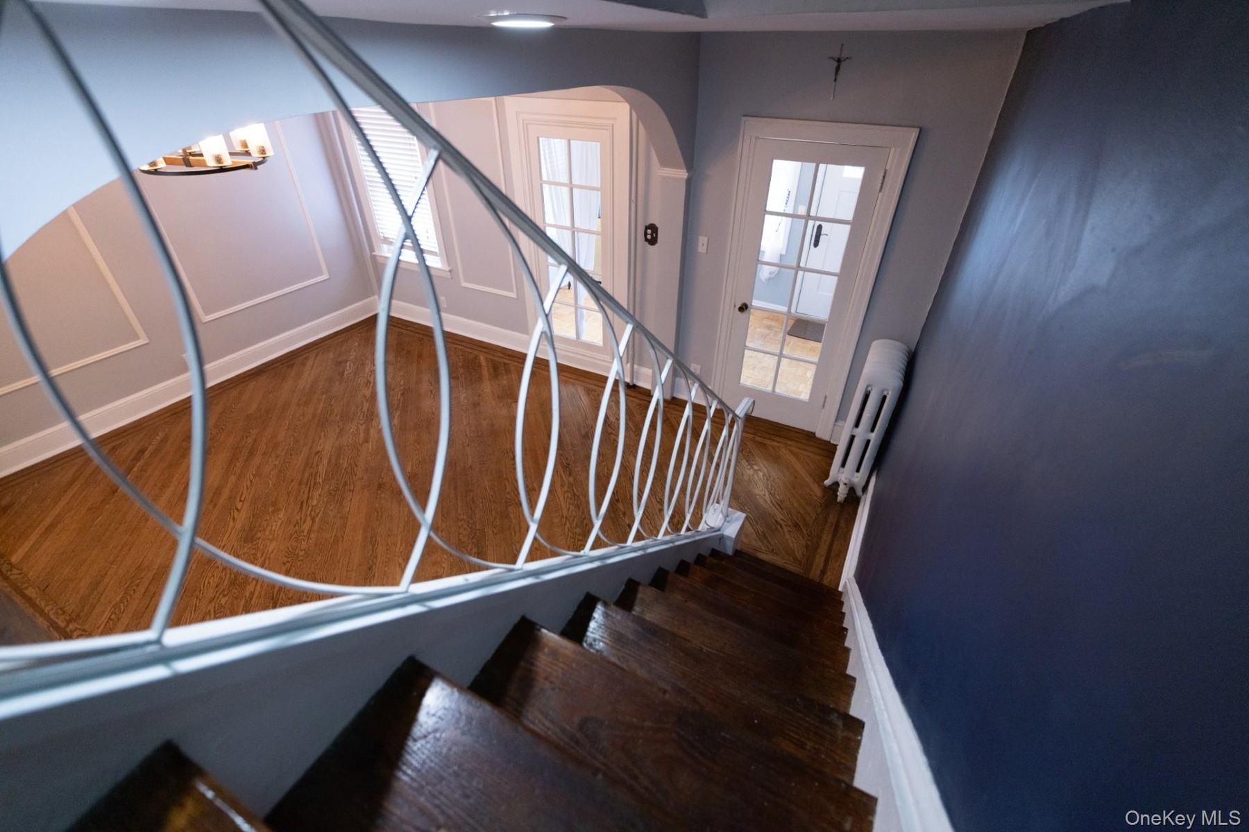 - Stairs featuring arched walkways, wood finished floors, radiator heating unit, and a chandelier