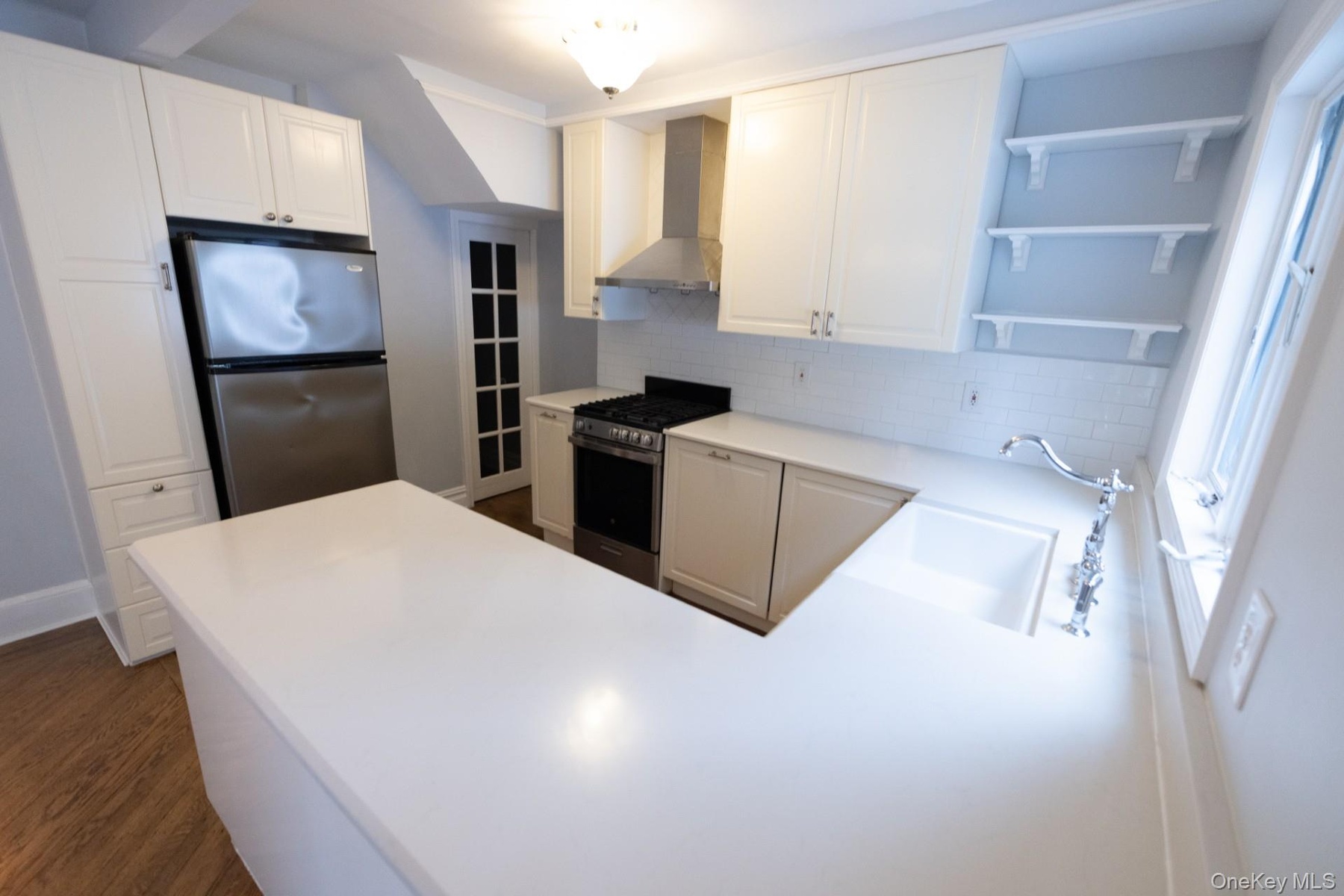 - Kitchen featuring backsplash, stainless steel appliances, a peninsula, wall chimney exhaust hood, and light countertops