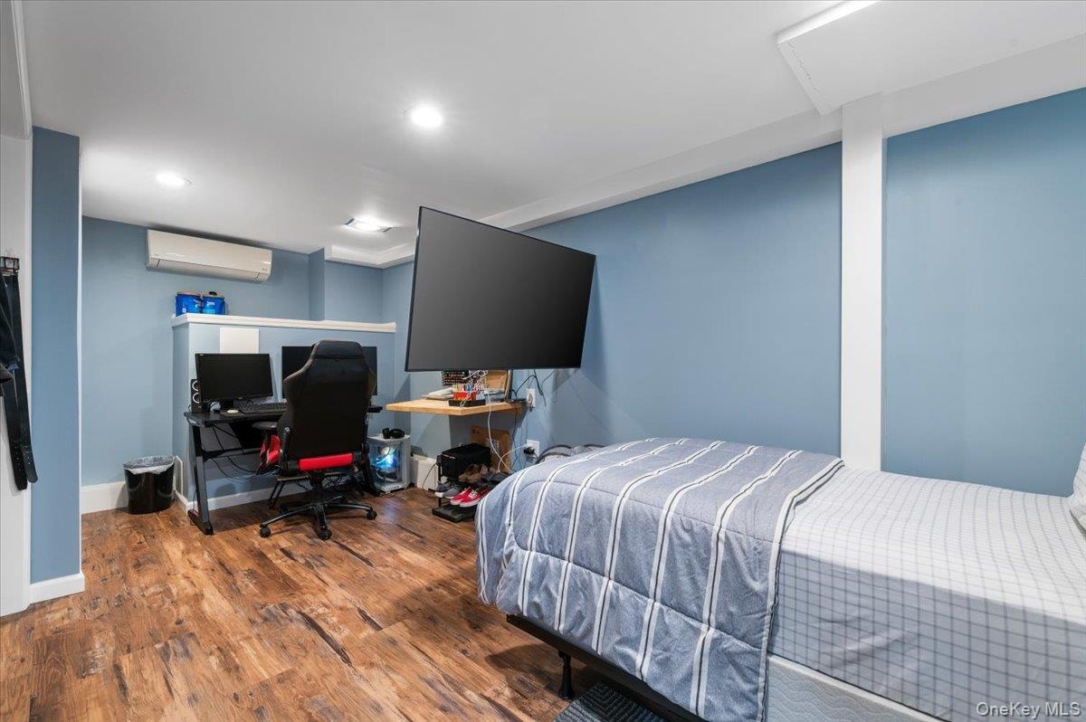 - Bedroom featuring a desk, wood finished floors, a wall mounted air conditioner, and recessed lighting