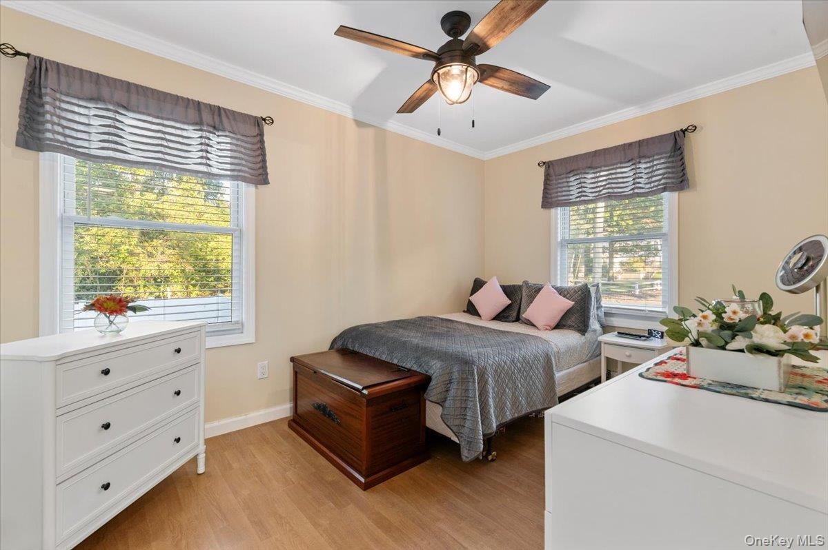 - Bedroom with ornamental molding, light wood finished floors, and a ceiling fan
