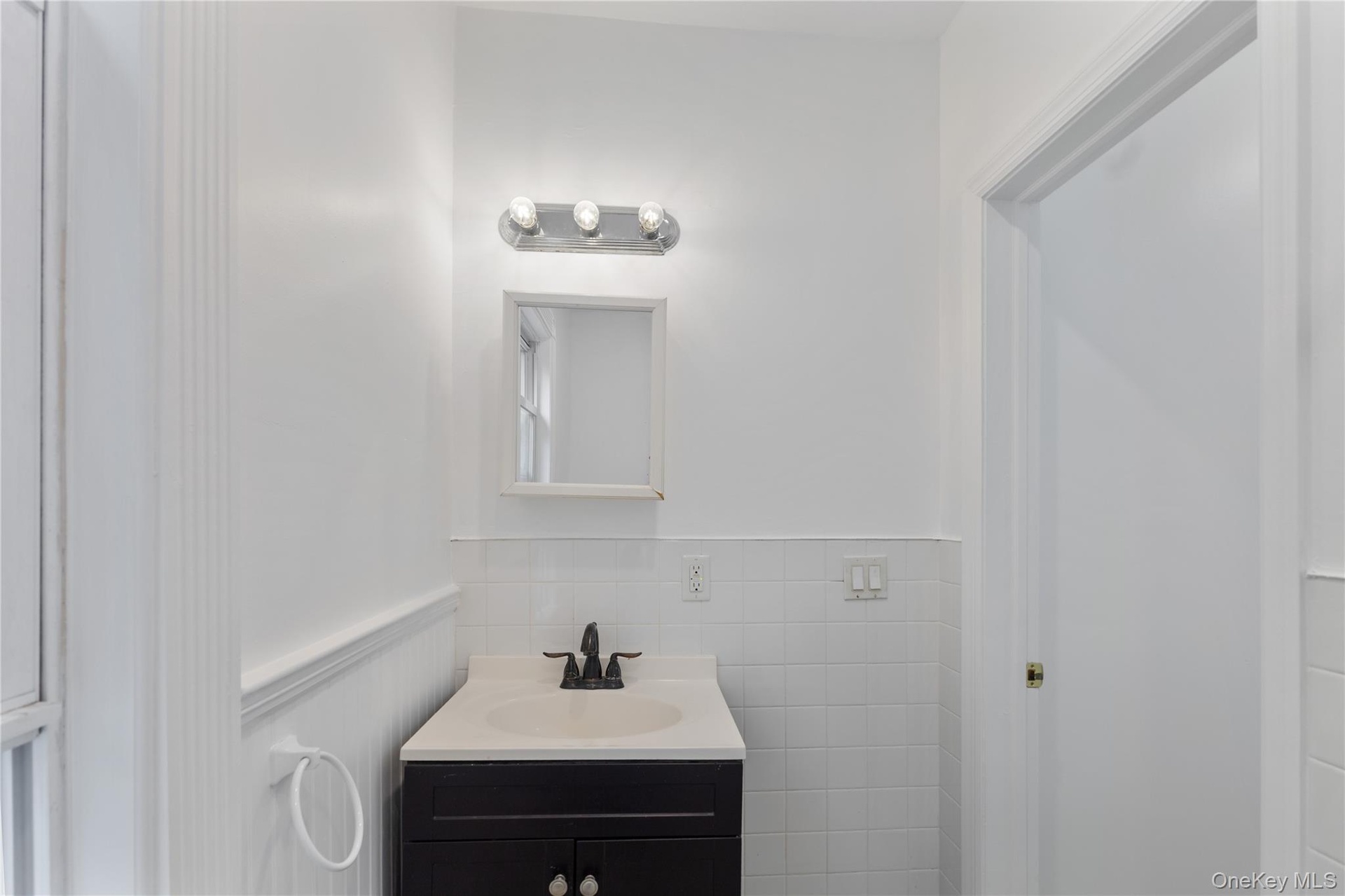 - Bathroom featuring wainscoting, vanity, and tile walls