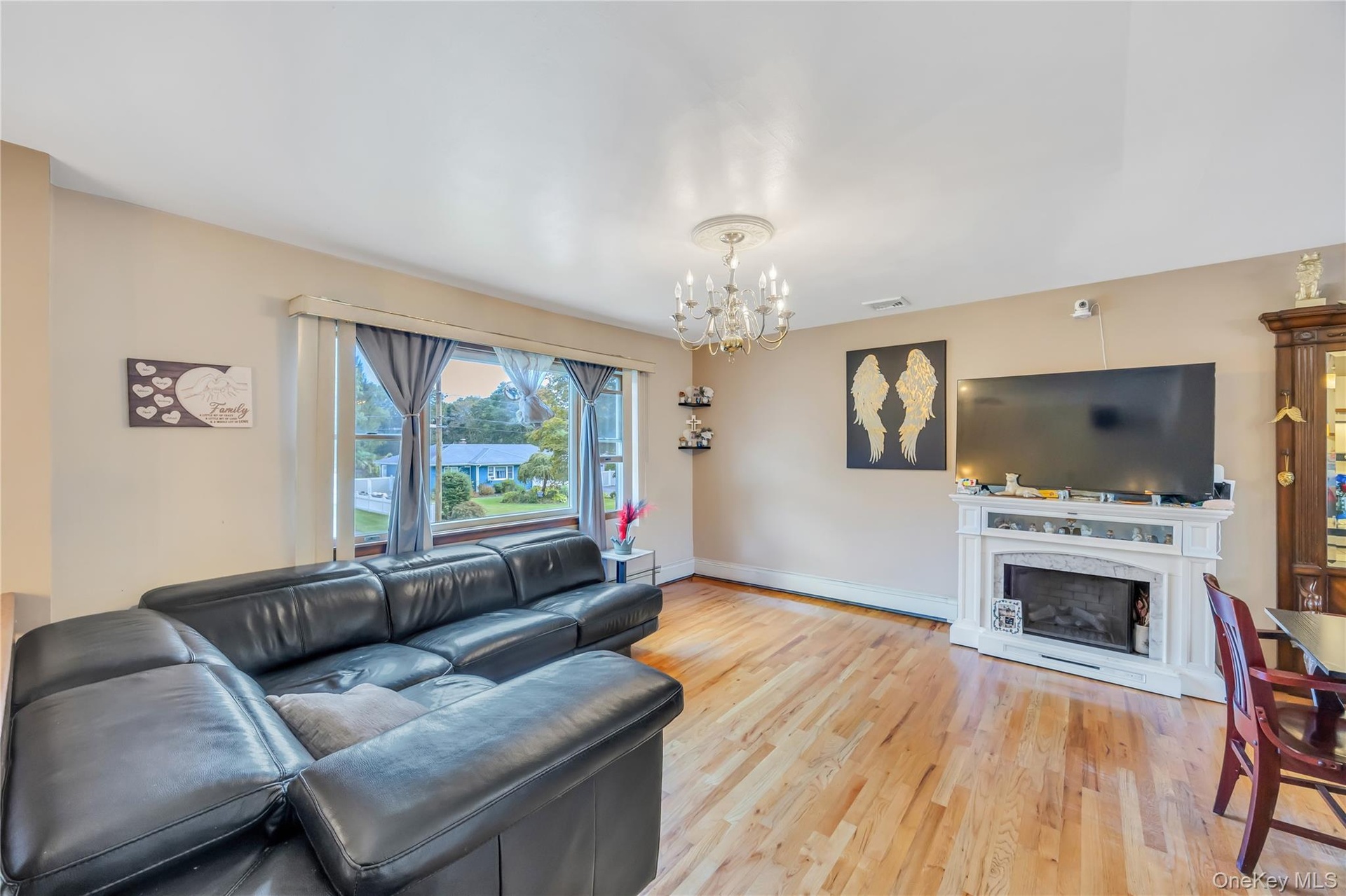 - Living area with a chandelier, light wood finished floors, a baseboard radiator, and heating unit