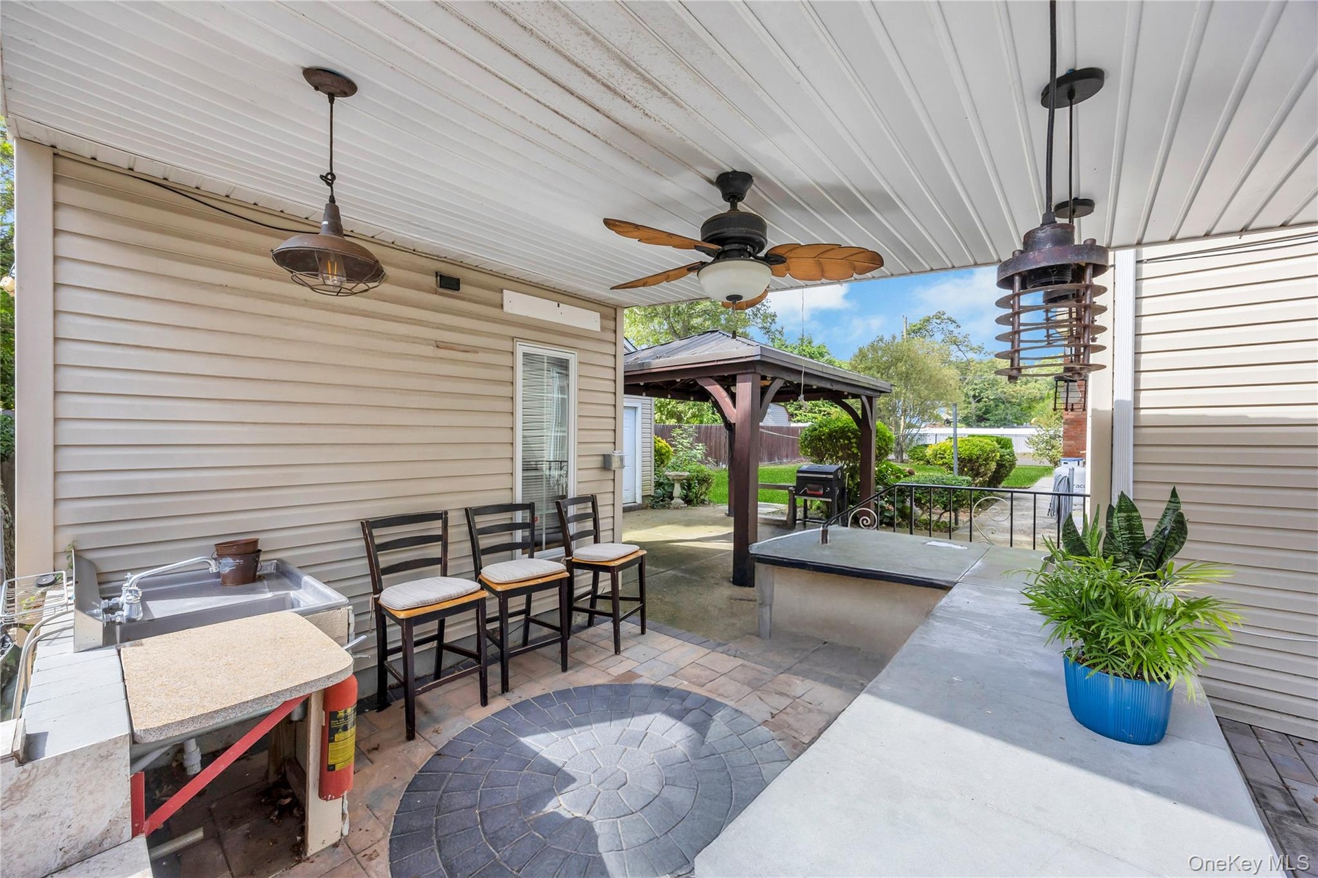 - View of patio / terrace featuring a gazebo and ceiling fan
