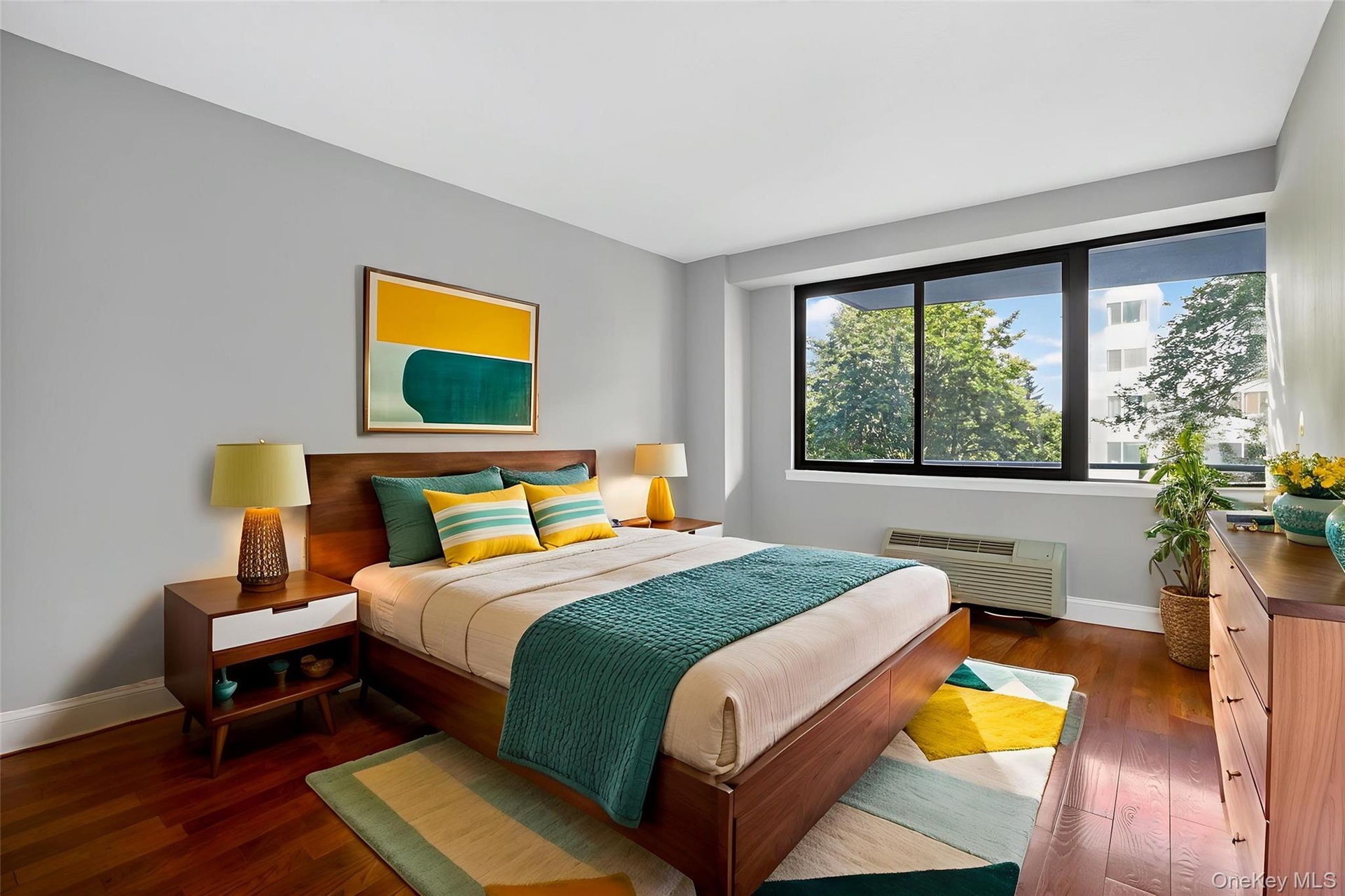 - Bedroom with dark wood-style flooring and a wall unit AC