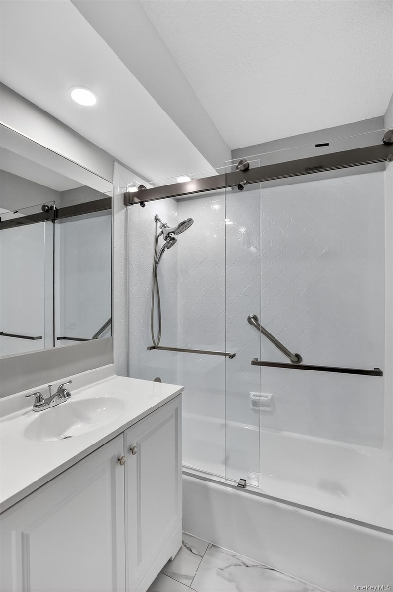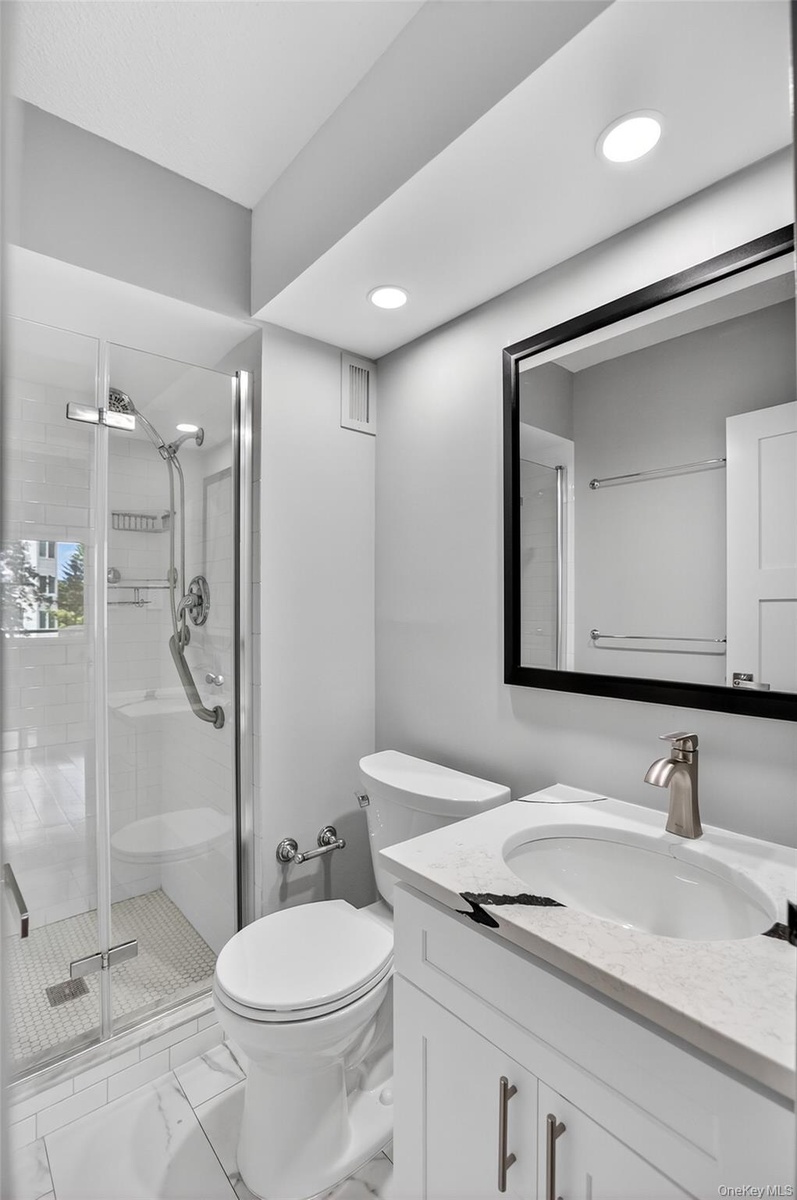 - Bathroom with a stall shower, vanity, and recessed lighting