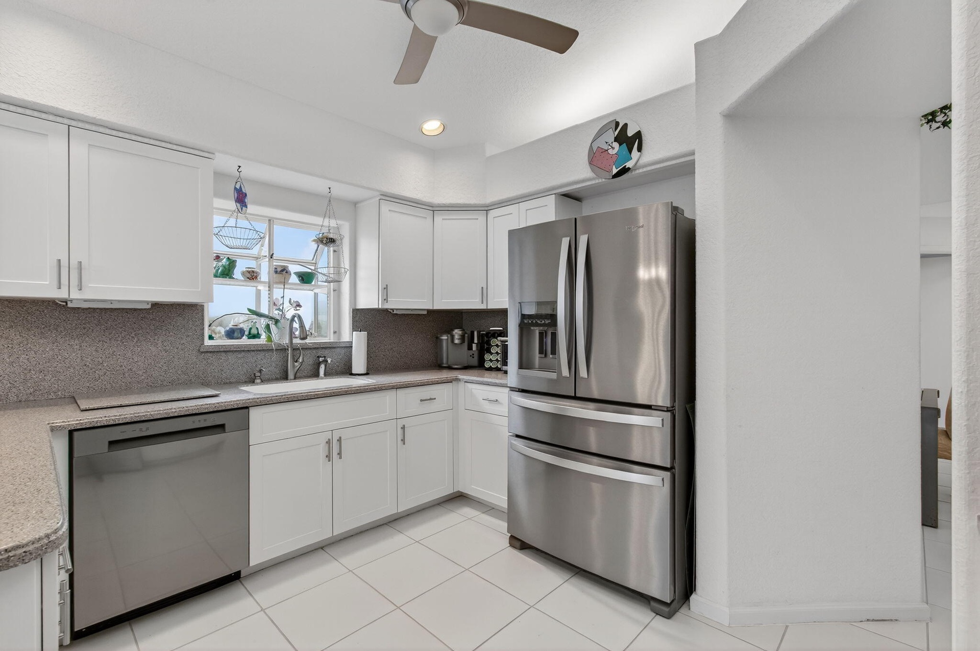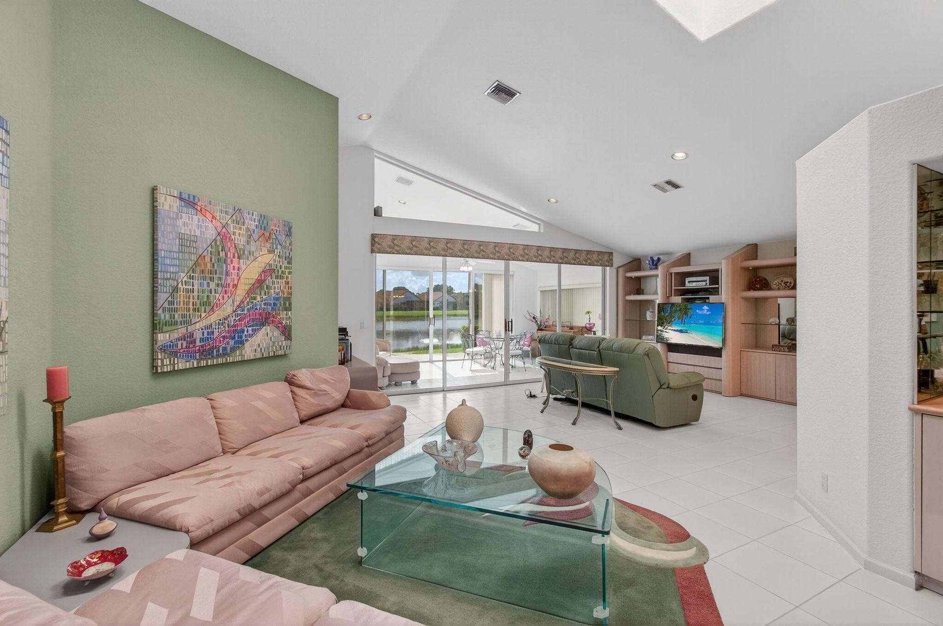This elegant three-bedroom, three-bath home is situated on a corner lot and offers picturesque views of both water and the golf course. Updated kitchen features white shaker cabinets w/solid surface counter top plus breakfast nook. Screen enclosed side patio is ideal for outdoor dining. Large living room includes a built-in wet bar with additional storage. Formal dining room and family room are enhanced by custom built-ins. The family room opens onto a glass-enclosed Florida room equipped with air conditioning. The primary bedroom is outfitted with integrated furniture, a large walk-in closet, and a beautifully renovated ensuite bathroom boasting a spa tub, separate shower, and dual vanity. Bedroom two has an en-suite bathroom plus walk-in closet. Bedroom three is large with big walk in