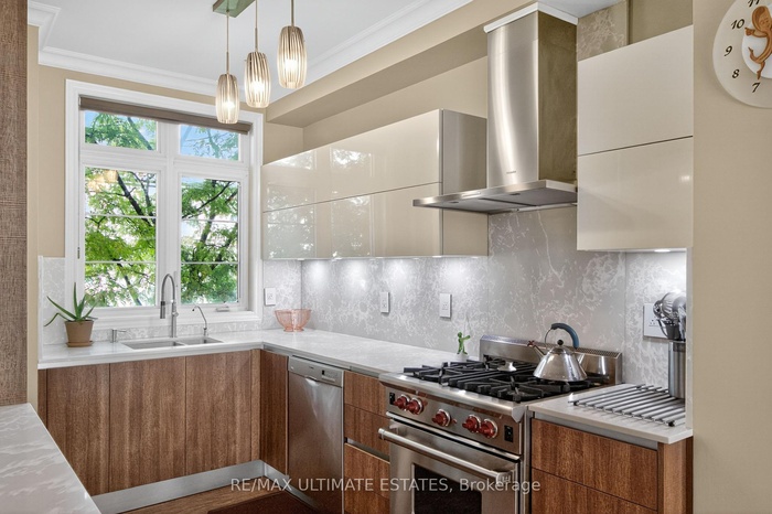 Stunning 4-bedroom townhouse with 9-ft ceilings, floor-to-ceiling windows, hardwood floors, built-in speakers, and recessed lighting. Chefs kitchen with custom Italian design and premium appliances: WOLF gas stove, MIELE fridge, Bosch dishwasher, Miele range hood. Primary suite features custom closets, Hunter Douglas coverings, and spa-like ensuite. South-facing balcony with BBQ hookup. Extras: heated roof, private 2-car tandem garage, and brand-new hot water tank. Steps to subway, TTC, dining, shopping, and entertainment.