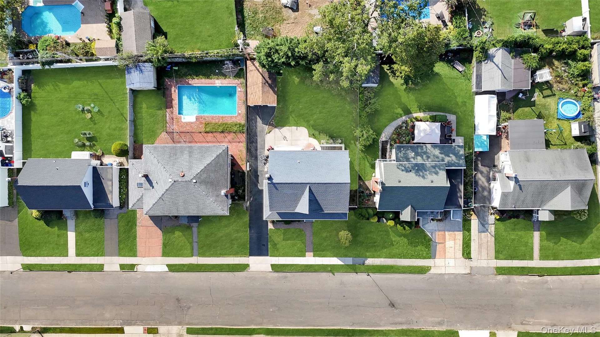 - Aerial perspective of suburban area featuring a pool