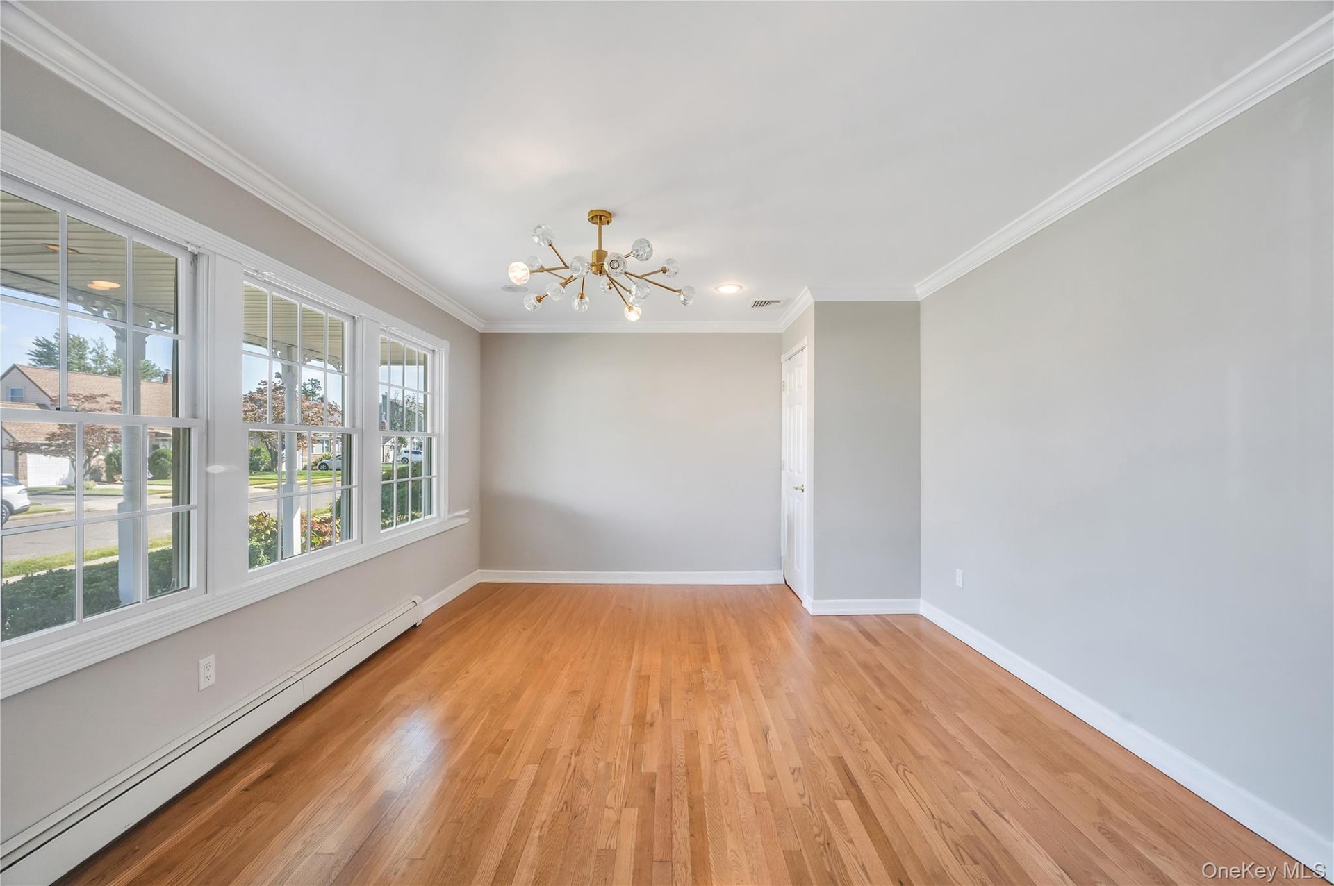 - Unfurnished living room with light wood-style floors, crown molding, recessed lighting, and a baseboard radiator