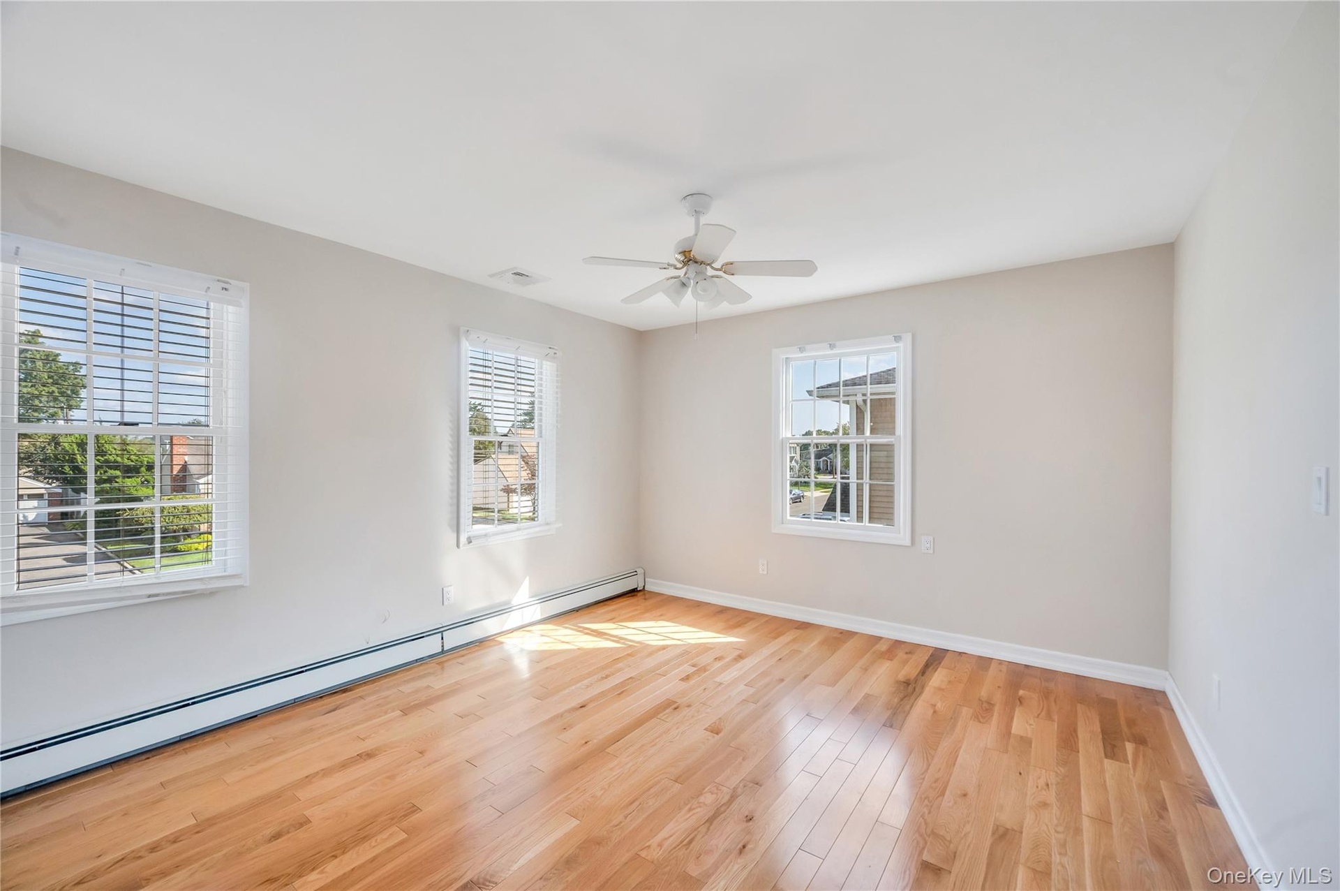- Unfurnished room featuring a baseboard radiator, light wood finished floors, and a ceiling fan