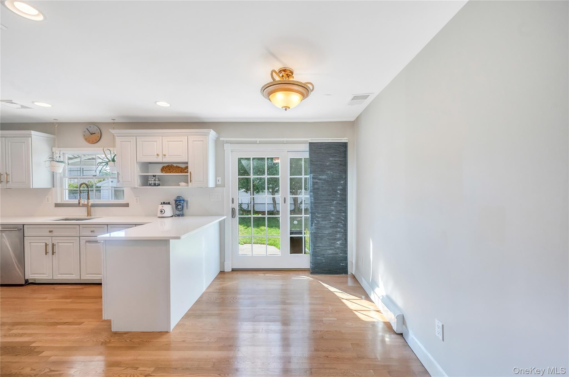 - Kitchen with stainless steel appliances, light wood-style flooring, a peninsula, white cabinetry, and recessed lighting