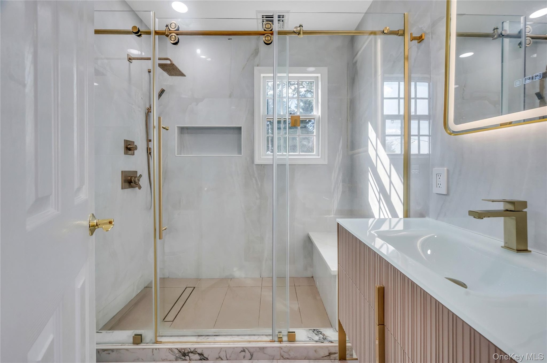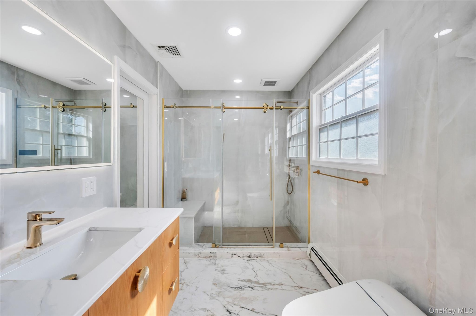 - Full bathroom with vanity, a marble finish shower, light marble finish flooring, a baseboard heating unit, and recessed lighting