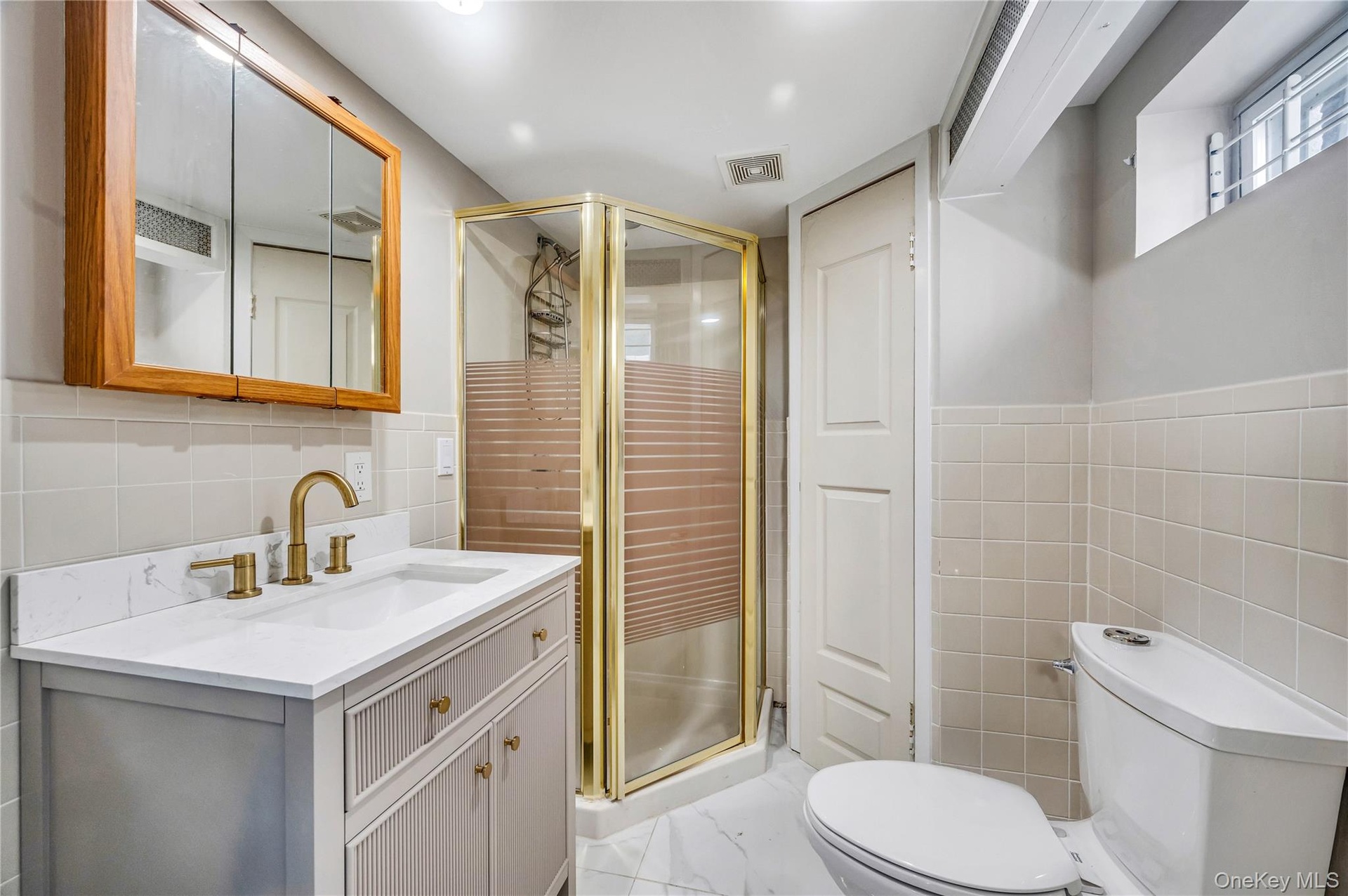 - Below grade area featuring light marble finish floors, healthy amount of natural light, baseboard heating, and recessed lighting