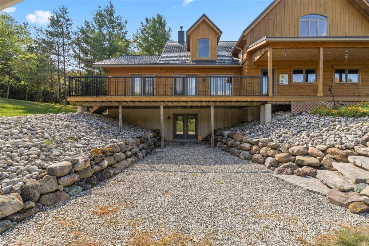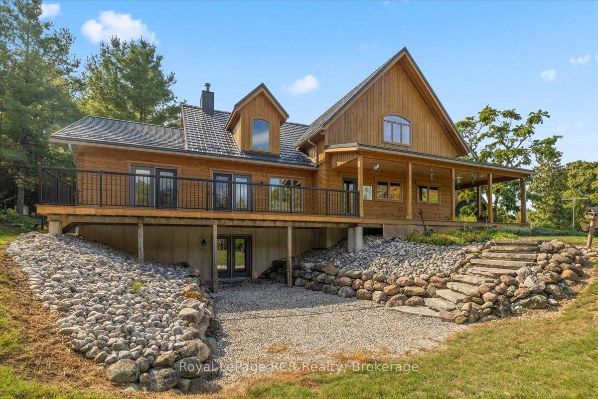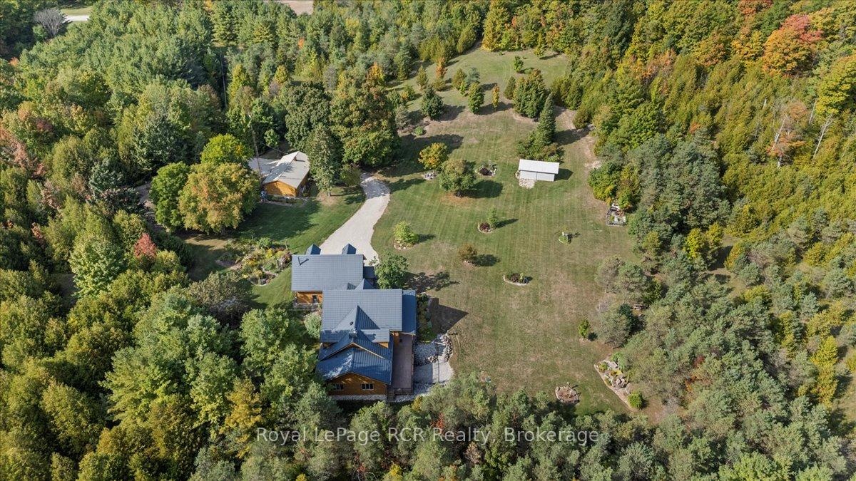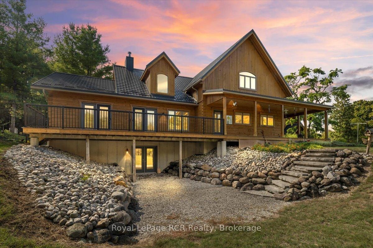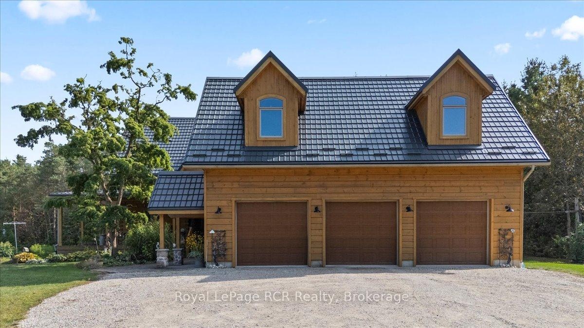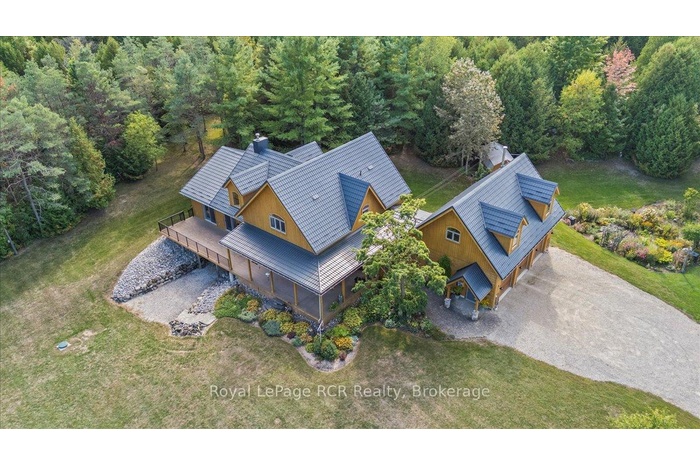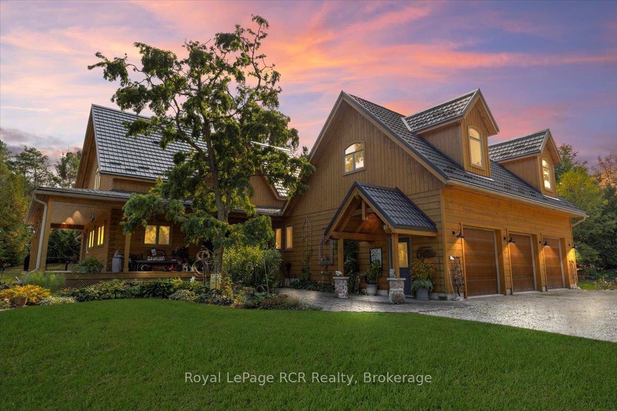 Luxury Country Retreat Nestled on a Peaceful, Private and Lovingly Landscaped 9.8-Acre Property. As you approach the magnificent log home, which commands attention, you'll be drawn to the front steps leading up to the welcoming composite porch, inviting you to explore the interior. As you step through the front door, you'll be greeted by a bright, spacious, and immaculate interior. The main floor showcases an impressive kitchen with an oversized island and a complete appliance package, dining area with access to expansive deck, a grand great room with soaring cathedral ceilings, and a stunning wood burning fireplace that makes a bold statement. The tranquil primary bedroom features a five-piece ensuite and a walk-in closet that meets your every need. Another full bathroom, a large laundry room, and a practical mudroom completes the main level. As you ascend the log stairs to the second level, you'll appreciate the open office space overlooking the main floor and discover two generous bedrooms sharing another well-appointed bathroom. The walkout basement presents endless possibilities - ample space for a workshop, storage, or your own custom finishing touches. There's also a substantial cold room with walk up access to the triple car garage, plus a fully finished loft above the garage with custom finishing touches that any guest would absolutely love and may never want to leave. After you've explored the spectacular interior, step outside to find an additional three-bedroom home awaiting your vision, along with a large storage shed and a garden shed, surrounded by many perennial flower beds. This property offers not just a home, but a serene lifestyle in a beautiful setting on a quiet country road within minutes to Allan Park Conservation Area where you can enjoy fishing, cycling, snowshoeing, skiing & hiking trails, and tobogganing. Are you ready to confidently claim this extraordinary home and property as your own?