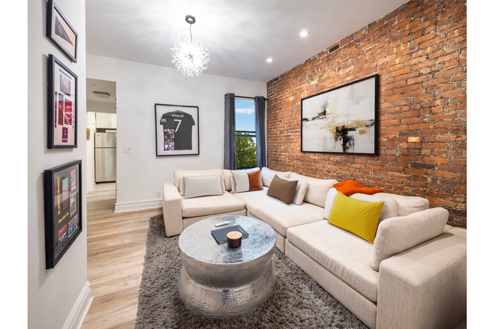 The apartment features soaring ceilings and loft-style windows in every room, flooding the home with natural light and enhancing its open, airy ambiance. The living room is accented with a striking exposed brick wall, solid oak hardwood floors, and custom lighting with plenty of space for a dining nook or home office. A tall built-in closet adds valuable storage to the already efficient layout.