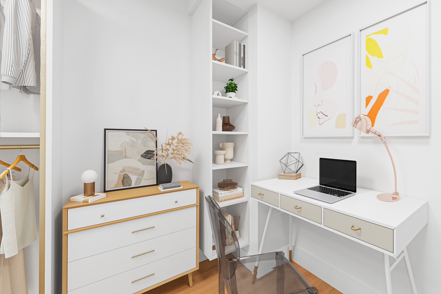 The apartment offers 1.5 bedrooms, including a large walk-in closet that can easily be transformed into a home office, nursery, or creative space. The open-concept living area is finished with 5-inch solid oak floors and anchored by a thoughtfully designed kitchen featuring stainless steel appliances, including a Bosch dishwasher and Blue Star gas stove, Caesarstone countertops, and solid maple front cabinets with generous storage.