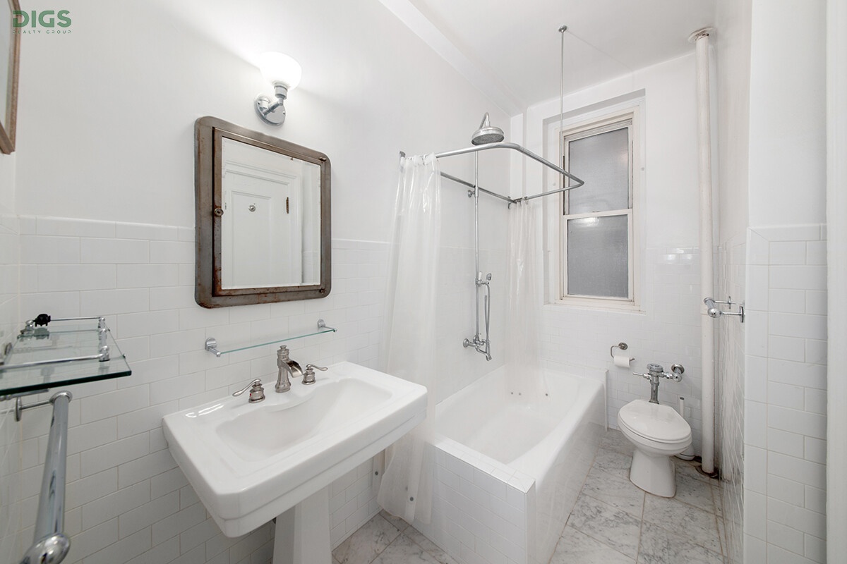 Both the living room and the bedroom face East and have expansive windows that flood the apartment with sunlight in the morning, creating a peaceful retreat in the heart of the city. The serene bedroom overlooks the internal courtyards, offering a sense of privacy and calm. It comfortably fits a king-size bed and features two large closets, providing excellent storage space. The spacious, windowed kitchen has abundant cabinetry and plenty of countertop space for cooking. There's also room for a small table for two, perfect for enjoying a morning coffee or a casual meal. Best of all, it includes a washer/dryer-an absolute must-have for modern city living. The classic bathroom is timeless, featuring white subway tiles, marble floors, a pedestal sink, and a soaking tub.