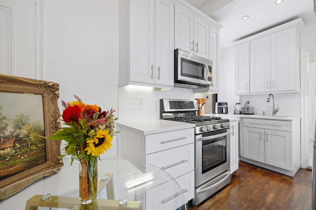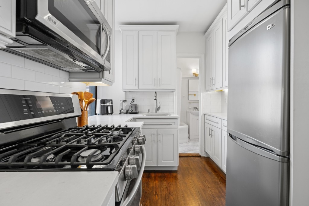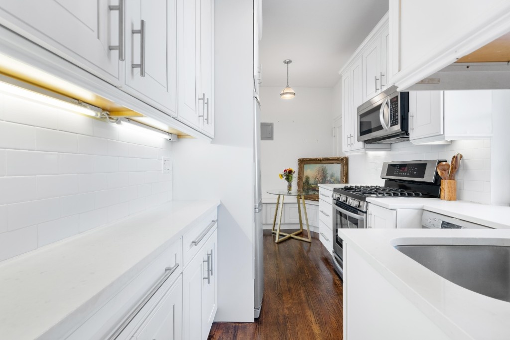 This sun-filled residence features a spacious living room with open southern views, high beamed ceilings, and elegant hardwood floors. The windowed eat-in kitchen is a chefs dream, complete with quartz countertops, marble backsplash, premium stainless-steel appliances (including a dishwasher), and abundant storage. The king-size bedroom offers peaceful light and excellent closet space, while the renovated windowed bathroom includes a deep soaking tub and stylish finishes. Every room is filled with natural light, creating a warm and inviting atmosphere.