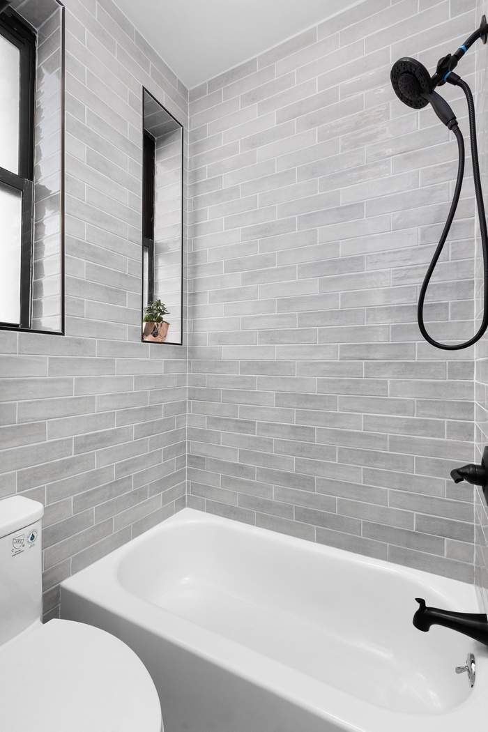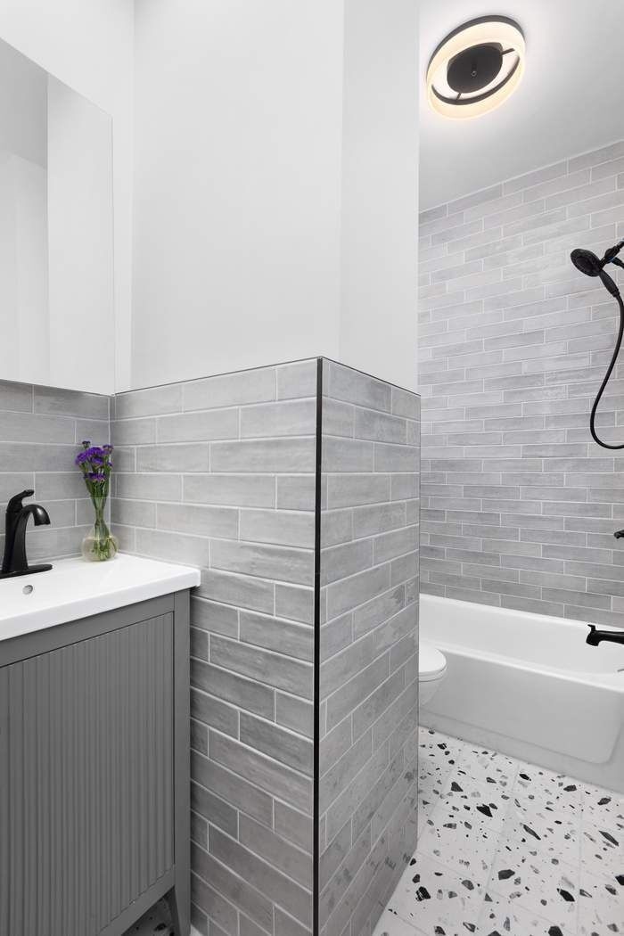 The open, windowed kitchen is outfitted with light-gray shaker cabinetry accented by fluted glass, a Summit stove, Classic by Unique refrigerator, American Standard fixtures and a breakfast bar. The windowed bathroom is designed with modern finishes, Delta tapware, and a deep soaking tub. The sleeping area is tucked away facing the building’s interior, creating a quiet retreat in the heart of downtown Manhattan.