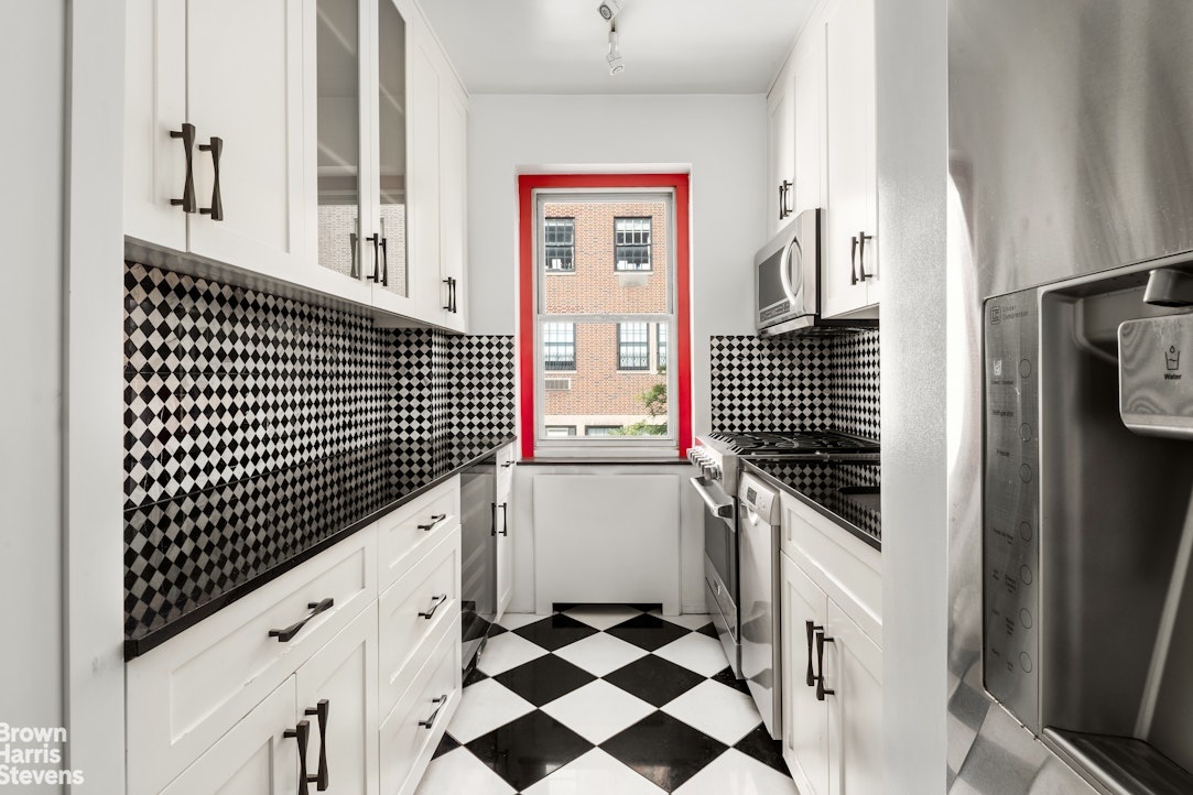 The apartment features a spacious layout with a large dining alcove that easily accommodates entertaining or a work-from-home setup. The windowed kitchen is a true standout, showcasing dramatic black-and-white checkered floors, glossy quartz countertops, custom white cabinetry, high-end stainless steel appliances, and a bold geometric tile backsplash.