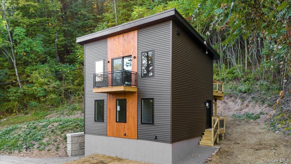 - Modern home with a balcony and a wooded view