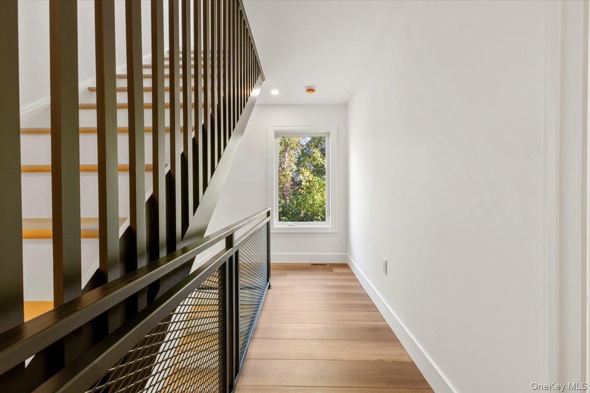- Stairs with wood finished floors and recessed lighting