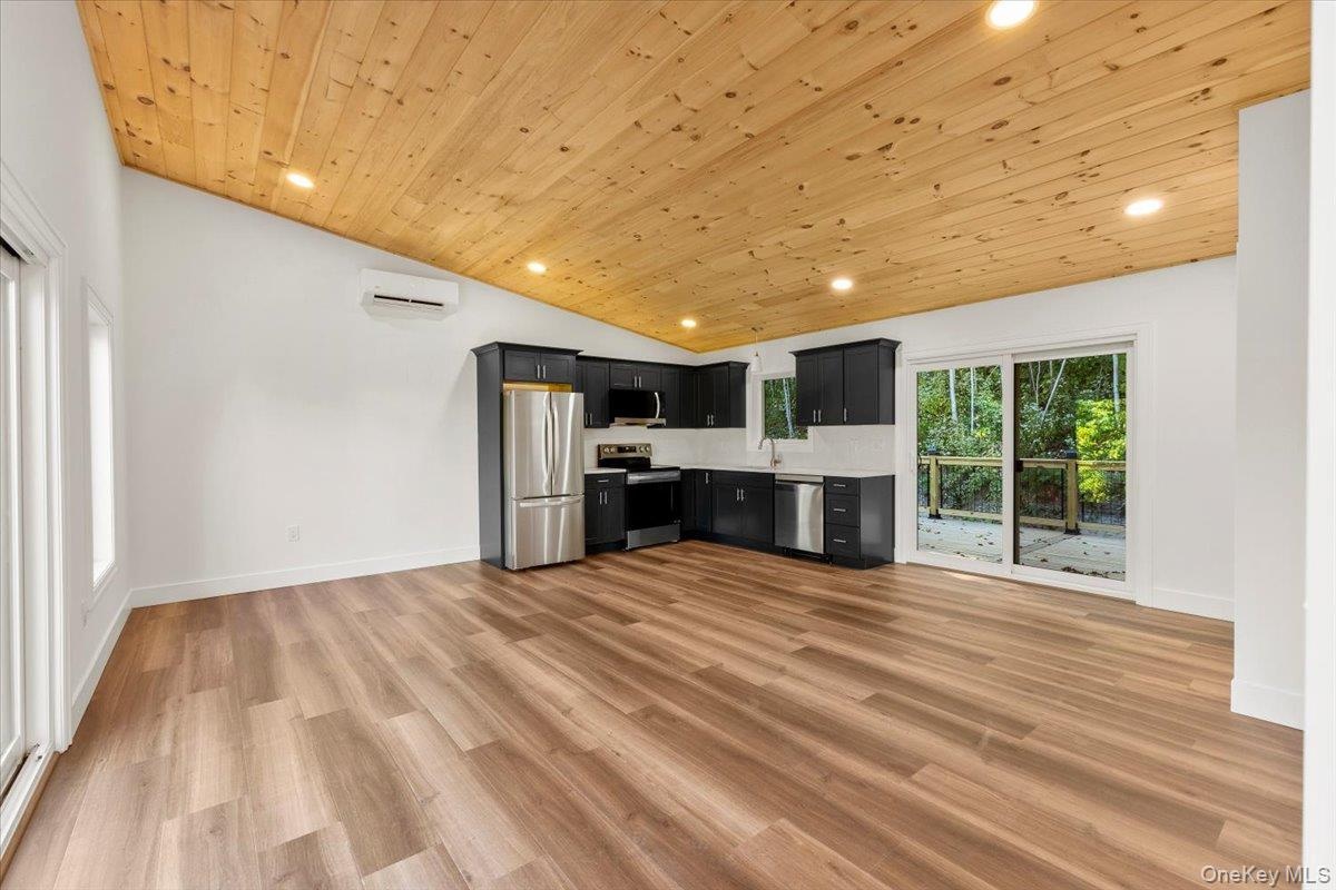 - Unfurnished living room with wood ceiling, lofted ceiling, recessed lighting, light wood-type flooring, and an AC wall unit