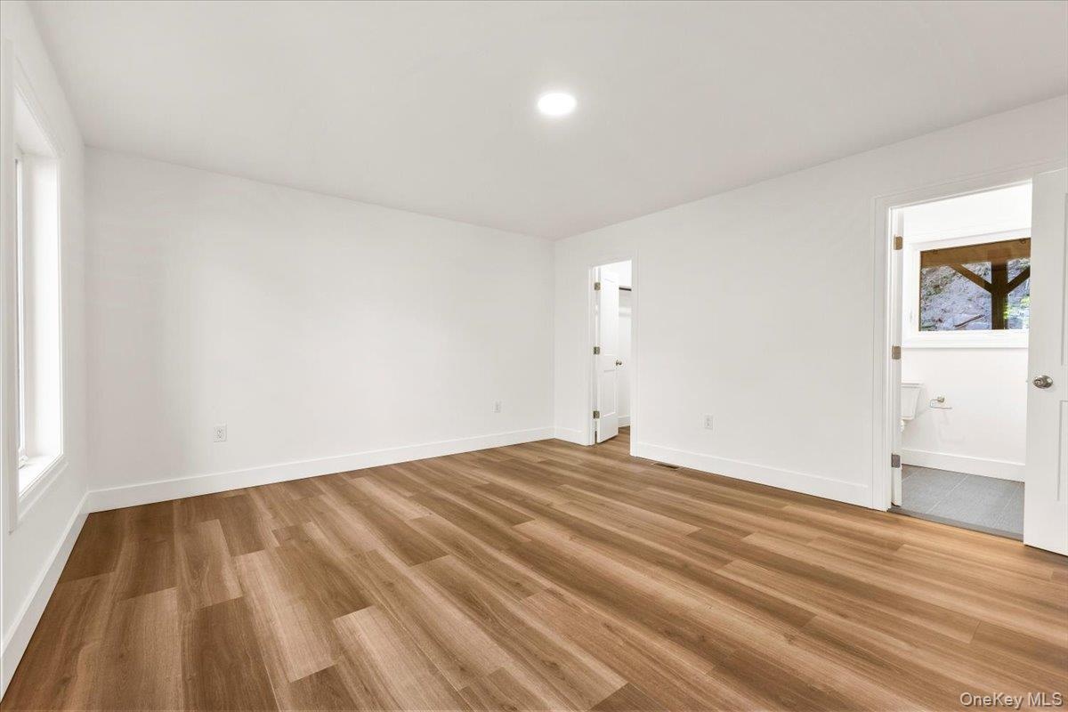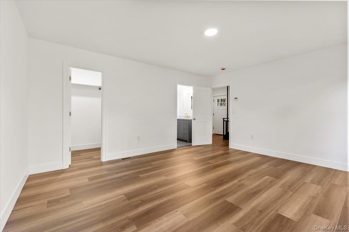- Unfurnished bedroom with a spacious closet, light wood-style flooring, recessed lighting, and ensuite bath