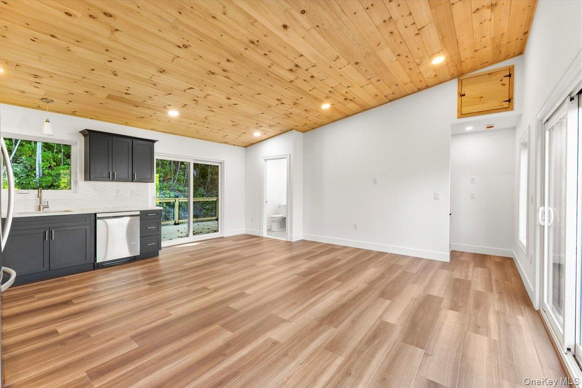 - Unfurnished living room with recessed lighting, wooden ceiling, light wood-style floors, and vaulted ceiling