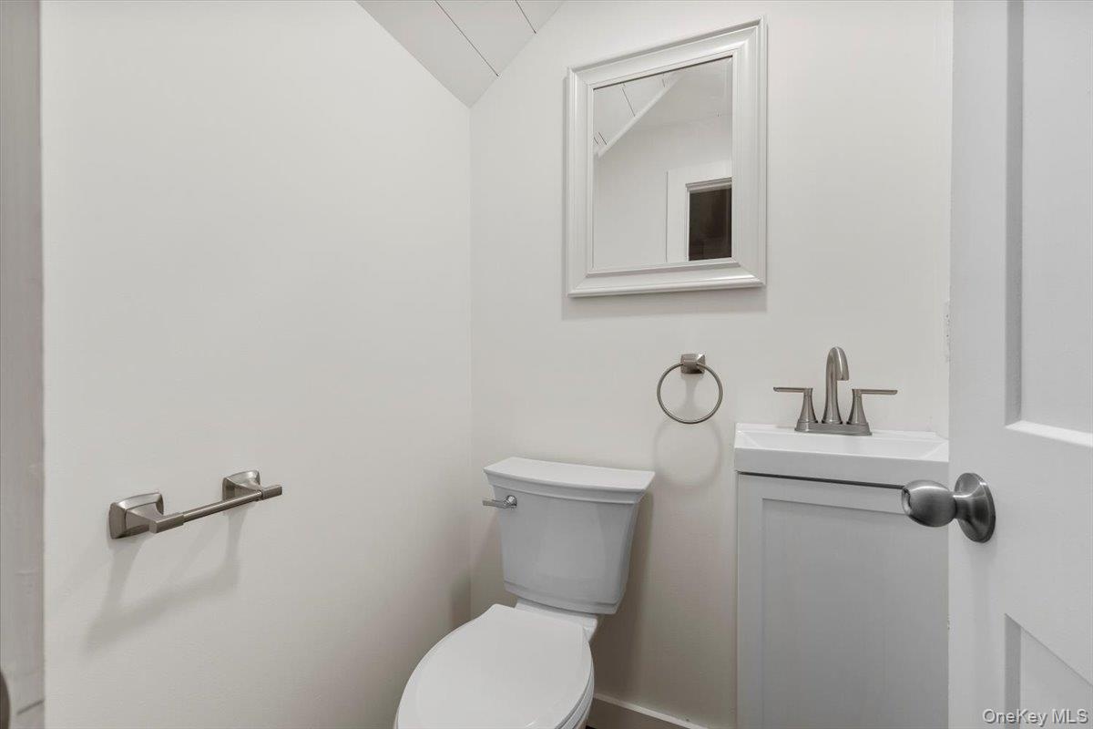 - Bathroom with vanity and lofted ceiling