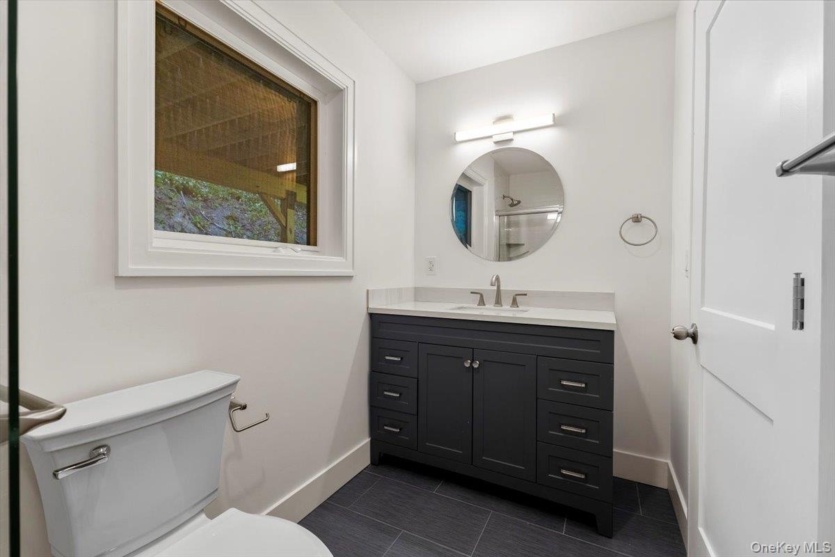 - Full bathroom featuring vanity and dark tile patterned flooring