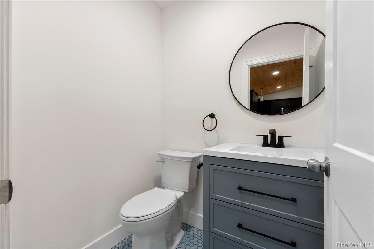 - Half bathroom featuring vanity and baseboards