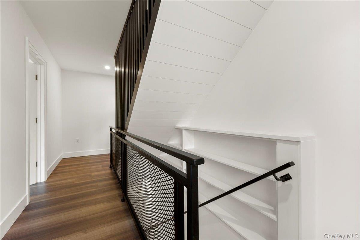 - Hallway with an upstairs landing, dark wood-style floors, and recessed lighting