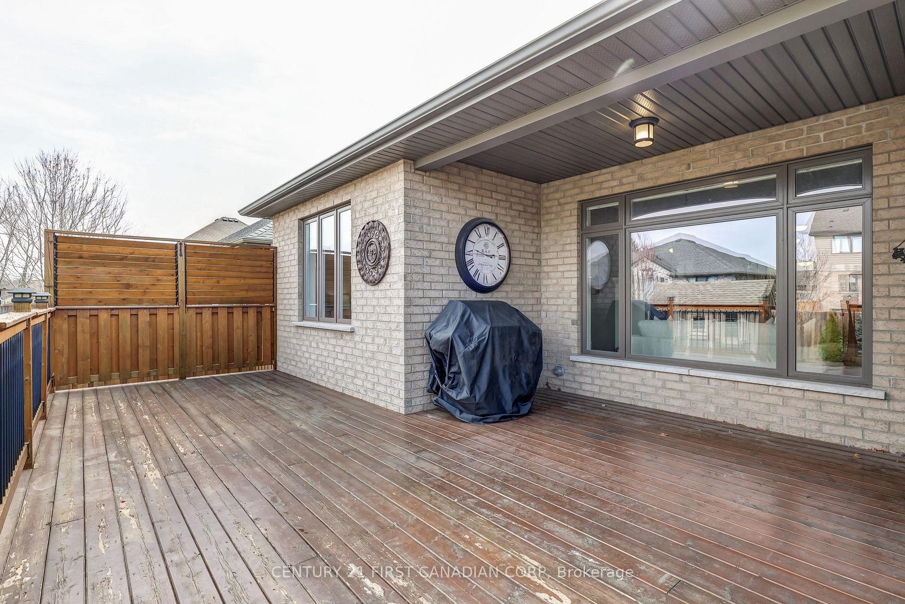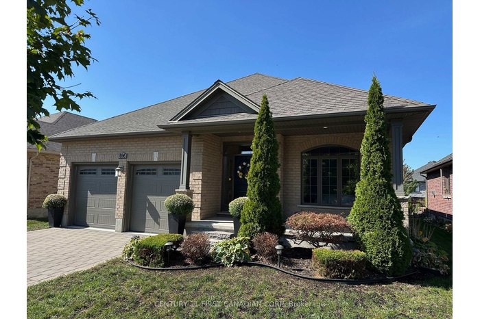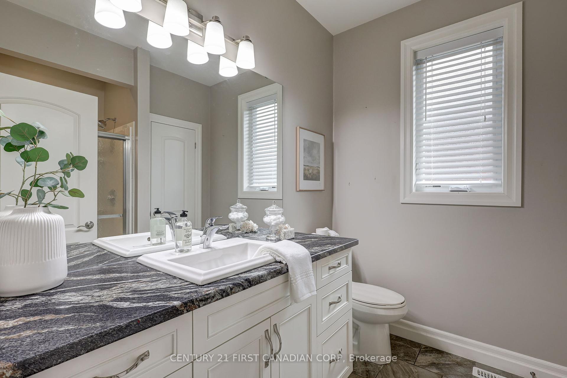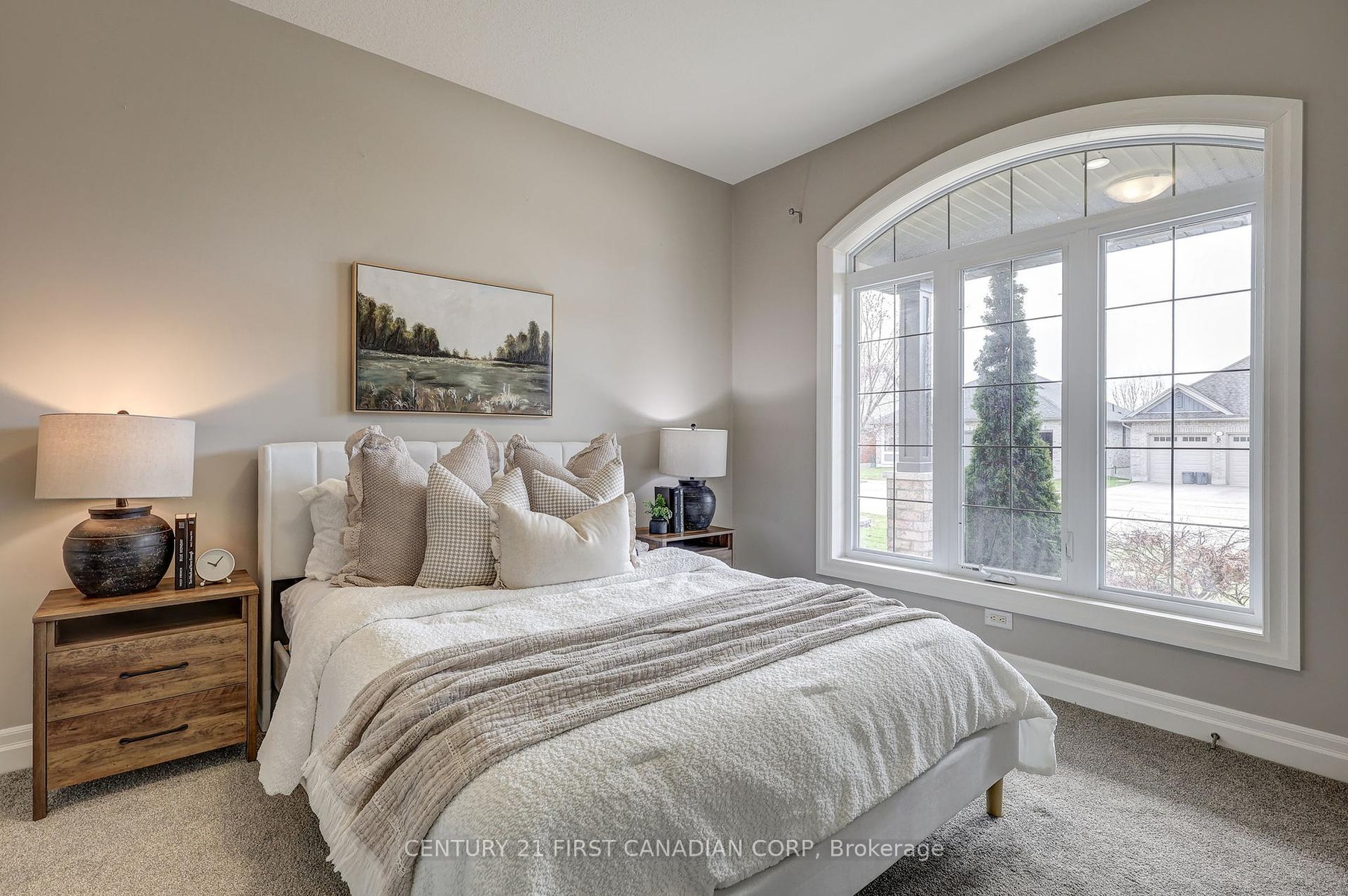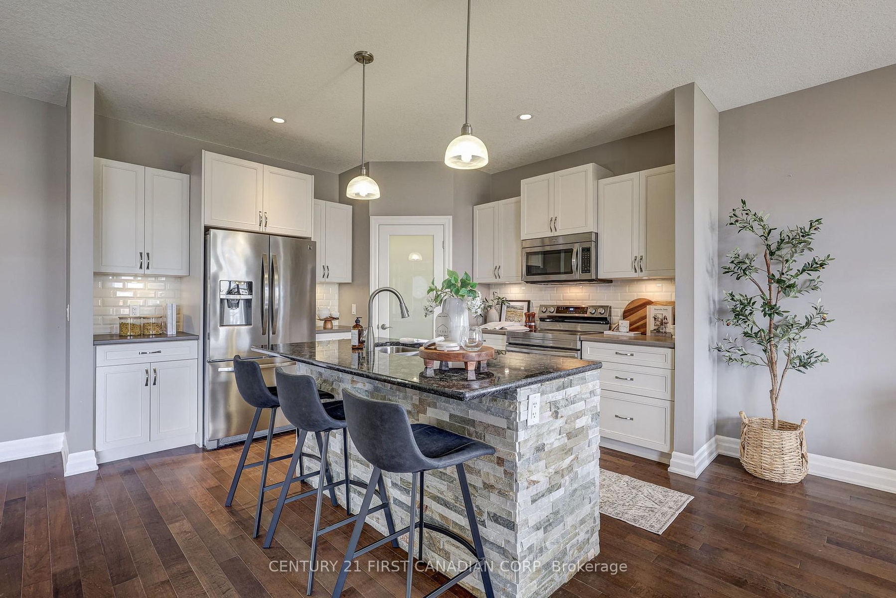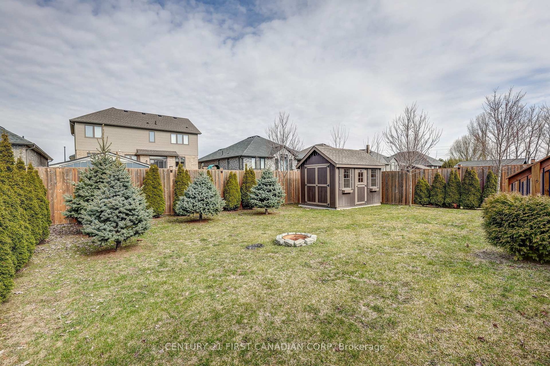 Incredible Value in This Former Model Ranch! Just 10-15 minutes between London and Strathroy, this beautifully maintained all-brick bungalow offers over 1,670 sq ft of luxury living on the main floor. The home features a spacious, open-concept layout with 10-ft tray ceilings, an inviting gas fireplace, and oversized windows that flood the space with natural light. The custom kitchen is a chefs dream - complete with granite countertops, stylish backsplash, under-cabinet lighting, and a large walk-in pantry. The well-appointed 2+1 bedrooms and 3 full bathrooms include a spacious primary suite with a walk-in closet and private ensuite. The professionally finished lower level adds (1135 sq ft) incredible living space with a full bedroom, full bathroom, large windows, and excellent lighting perfect for guests or extended family. Enjoy fully landscaped grounds, a fully fenced backyard, and fantastic outdoor living space including a covered front porch, a large deck, and a custom-built shed. Located in a quiet, family-friendly neighborhood just minutes from the 402, schools, parks, and local amenities. This move-in-ready home offers exceptional value - dont miss this opportunity! One call and you're in! Note: Low property taxes.