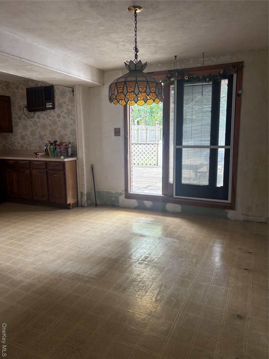 - Unfurnished dining area with light flooring, a textured ceiling, and wallpapered walls