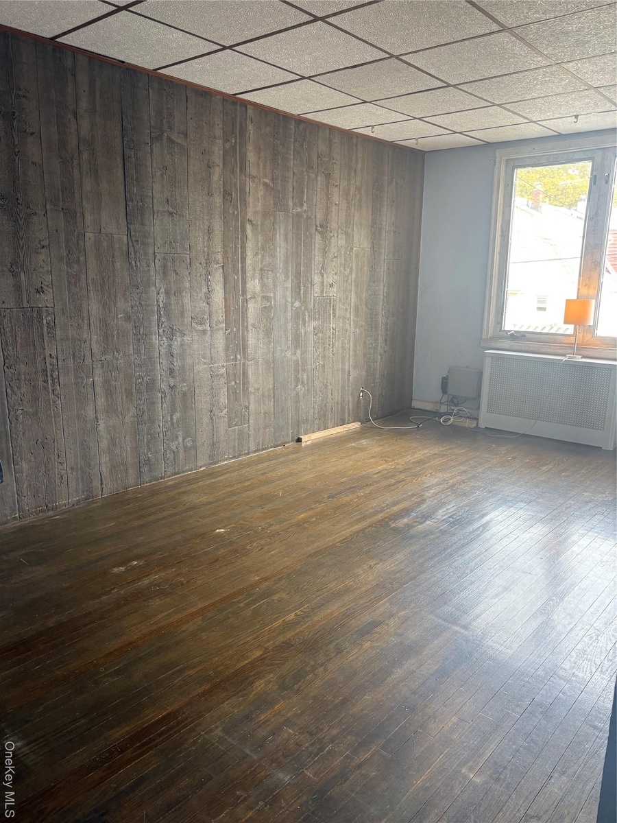 - Unfurnished room with wood walls, dark wood finished floors, radiator heating unit, and a drop ceiling