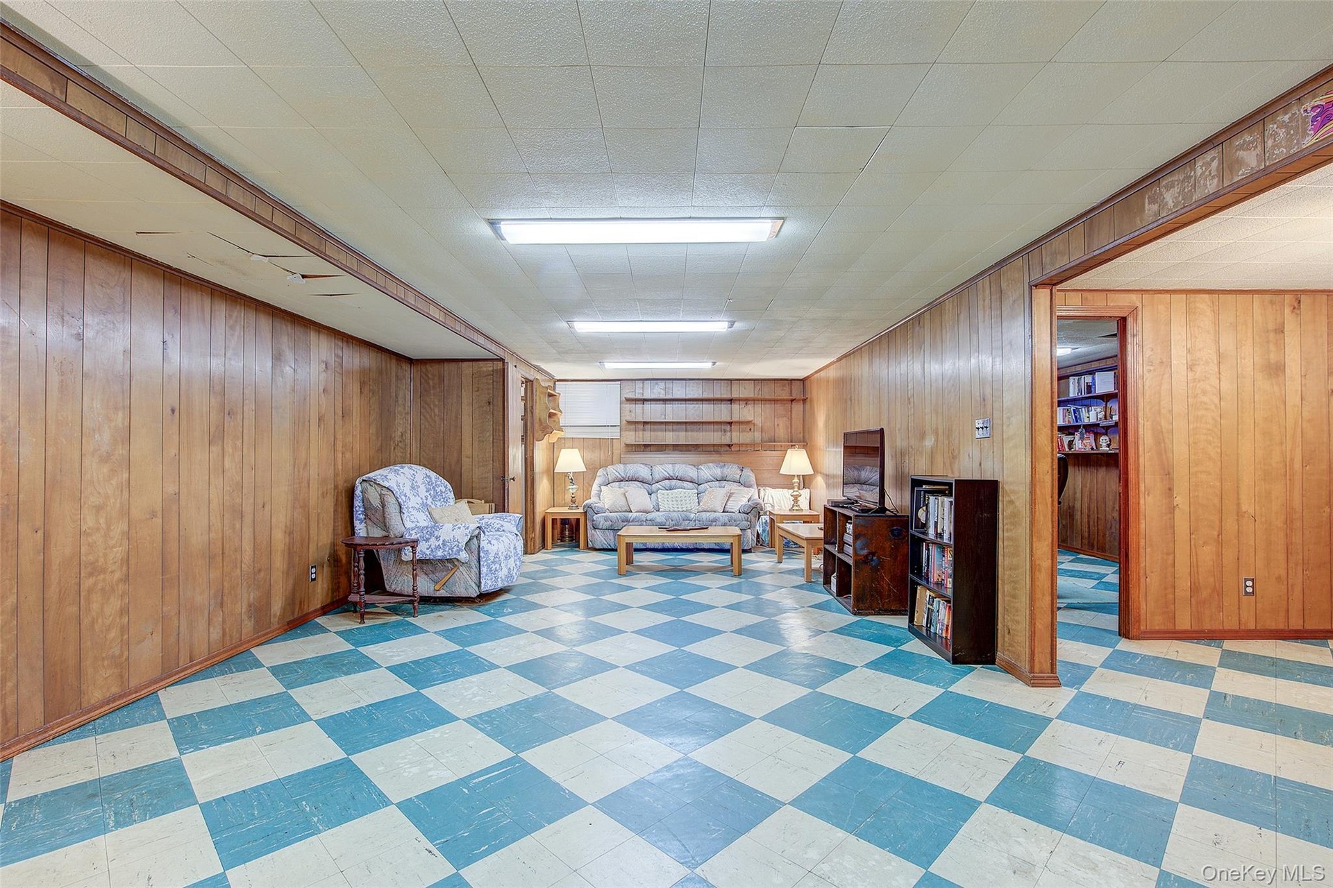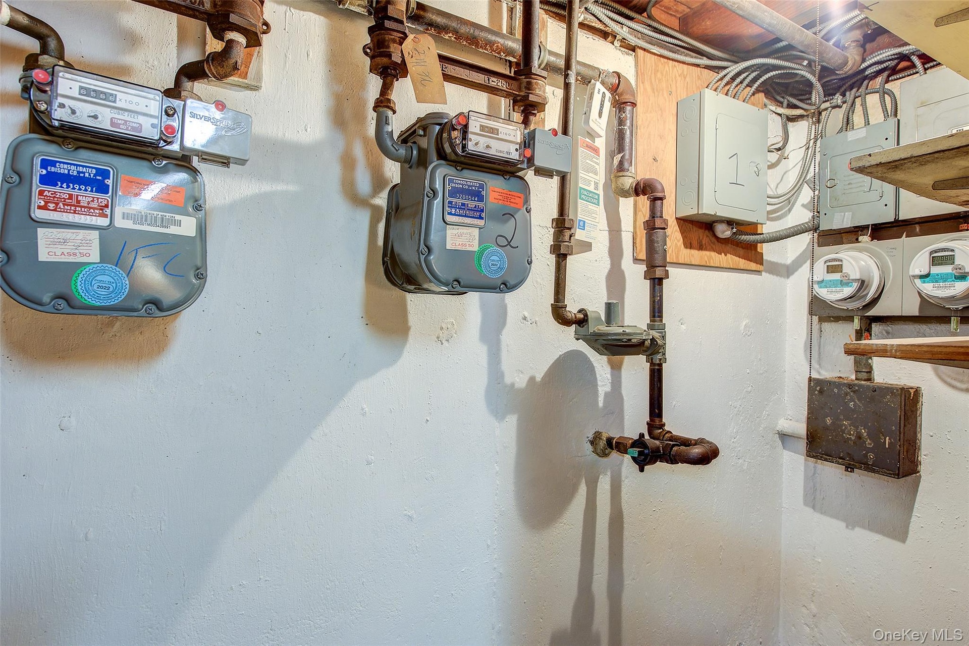 - Below grade area with tile patterned floors, gas water heater, and a heating unit
