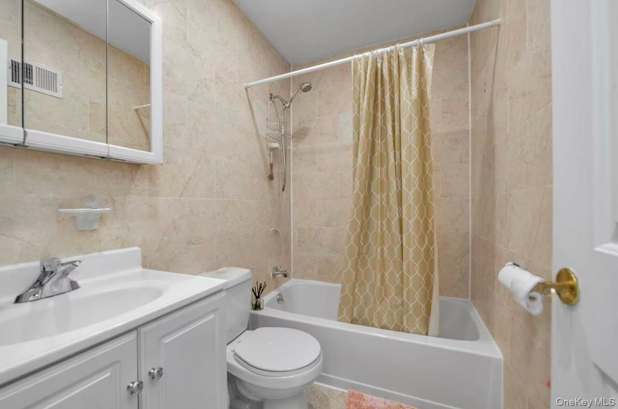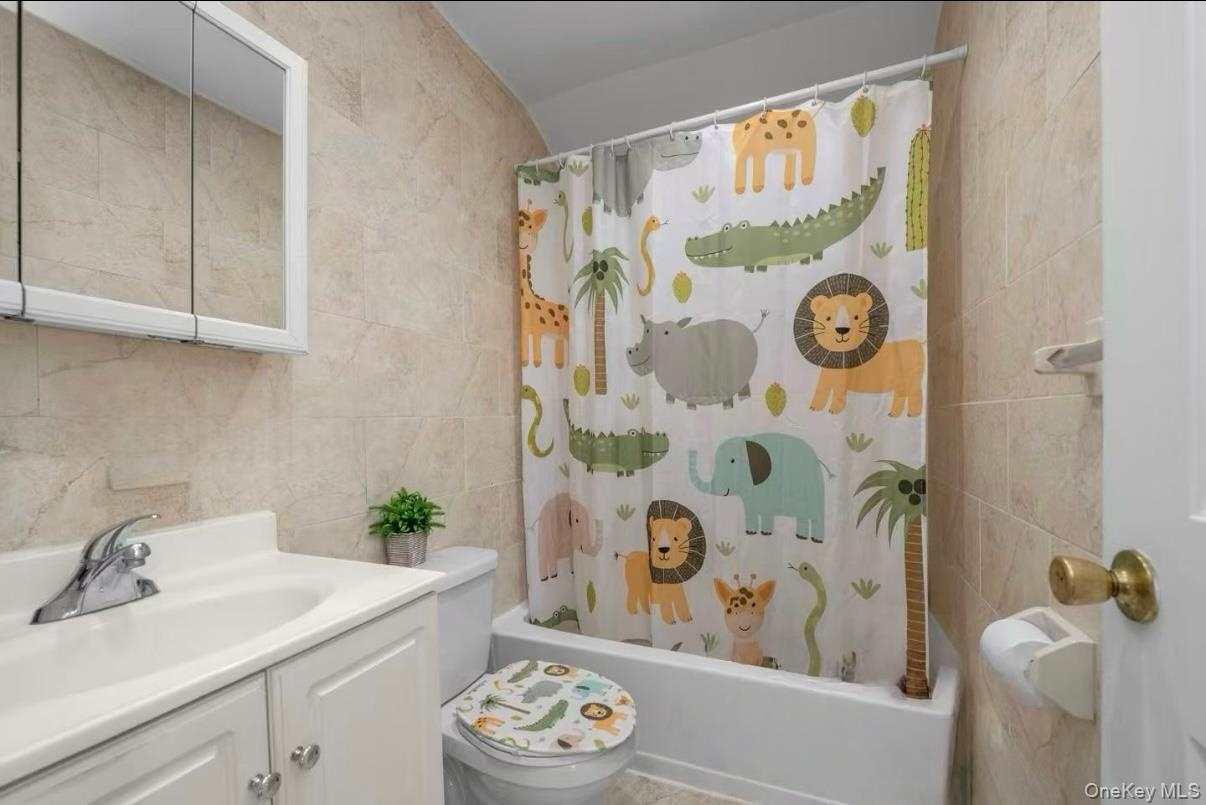 - Full bathroom with tile walls, shower / tub combo with curtain, and vanity