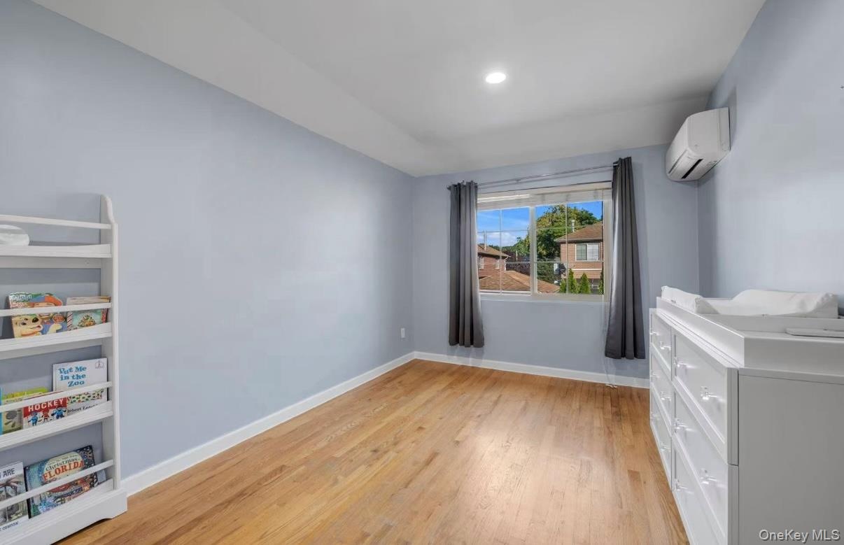 - Unfurnished bedroom featuring light wood-type flooring, an AC wall unit, and recessed lighting
