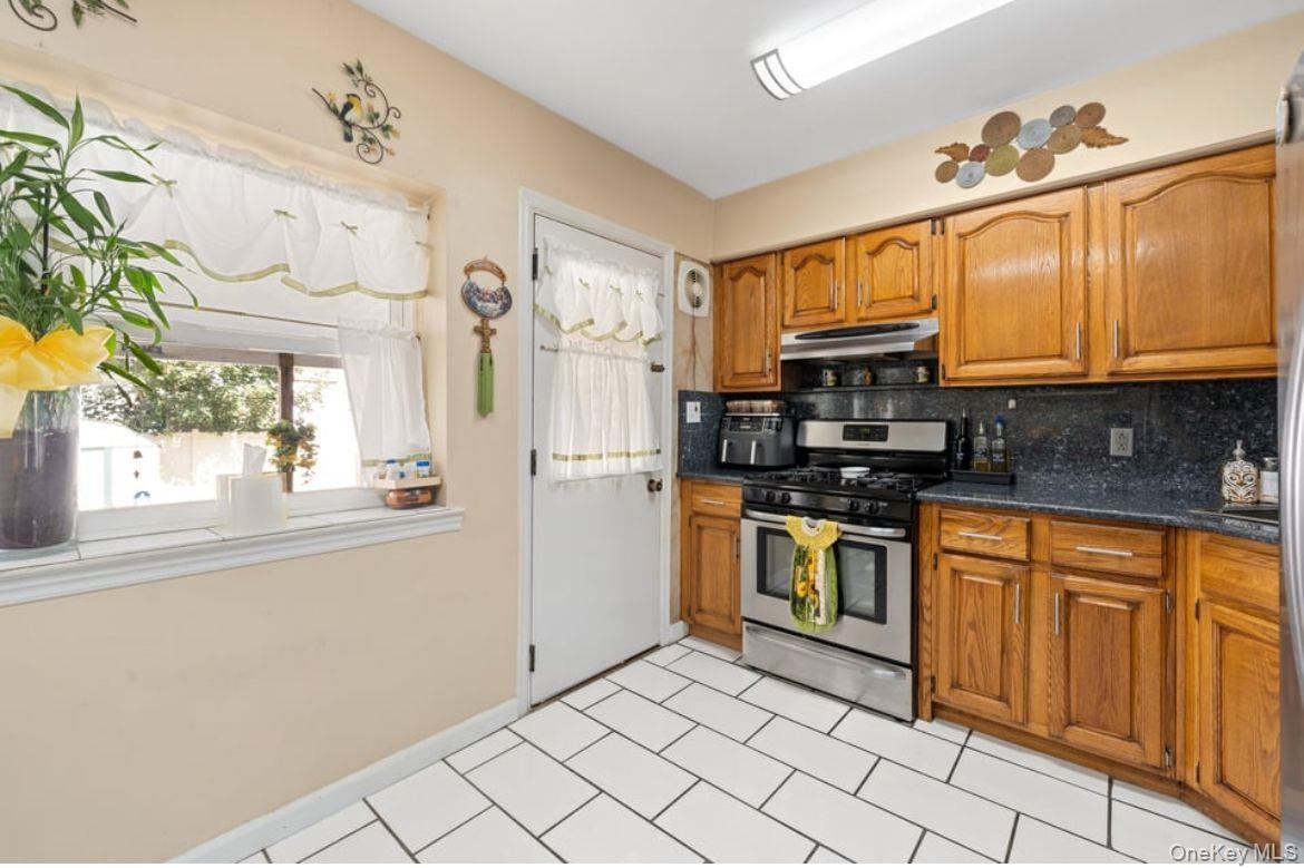 - 1st Floor, kitchen with stainless steel appliances, brown cabinetry, dark countertops, tasteful backsplash, and light tile patterned flooring