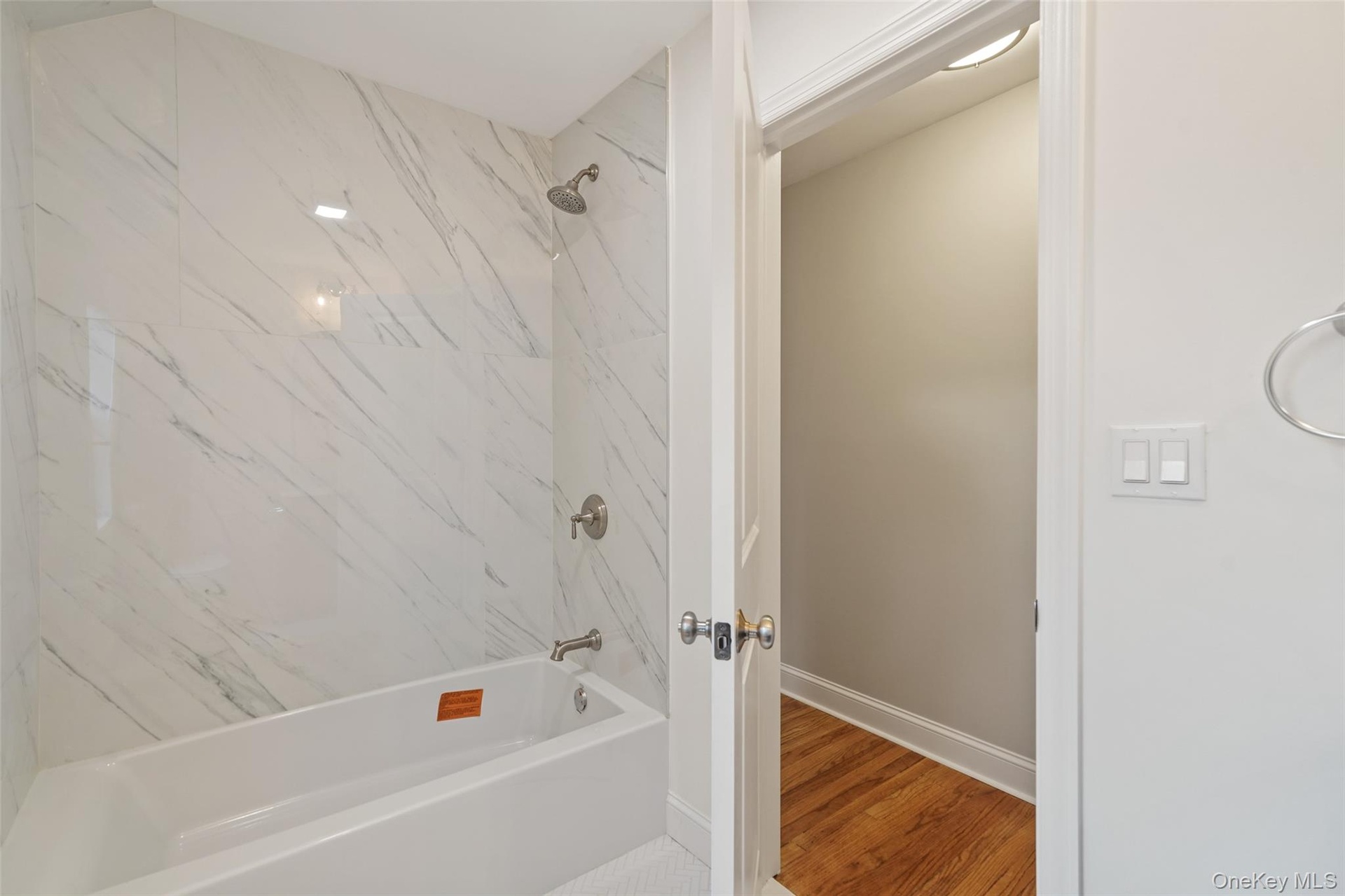 - Bathroom with bathing tub / shower combination and wood finished floors