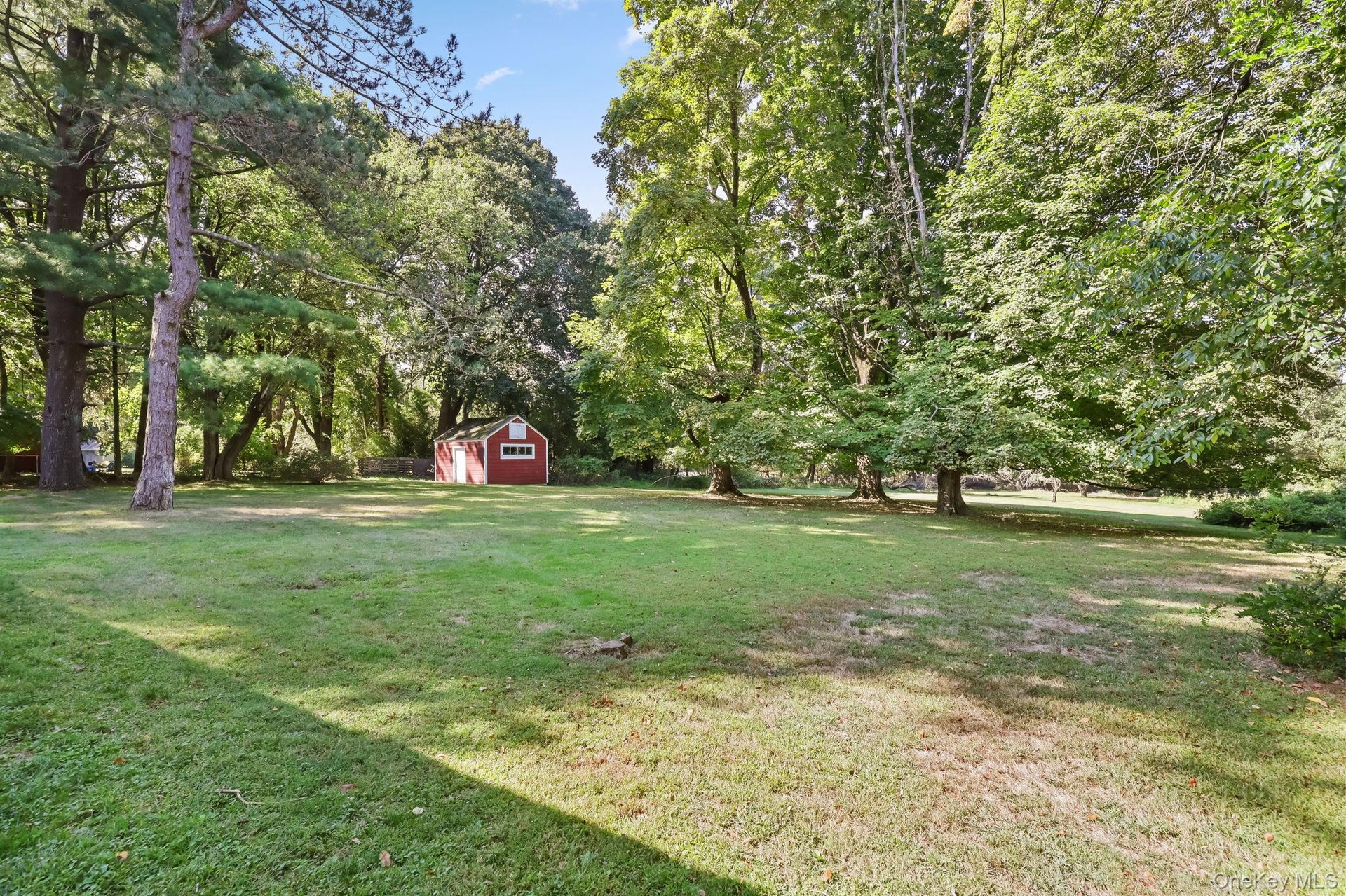 - View of green lawn featuring a storage unit and view of scattered trees