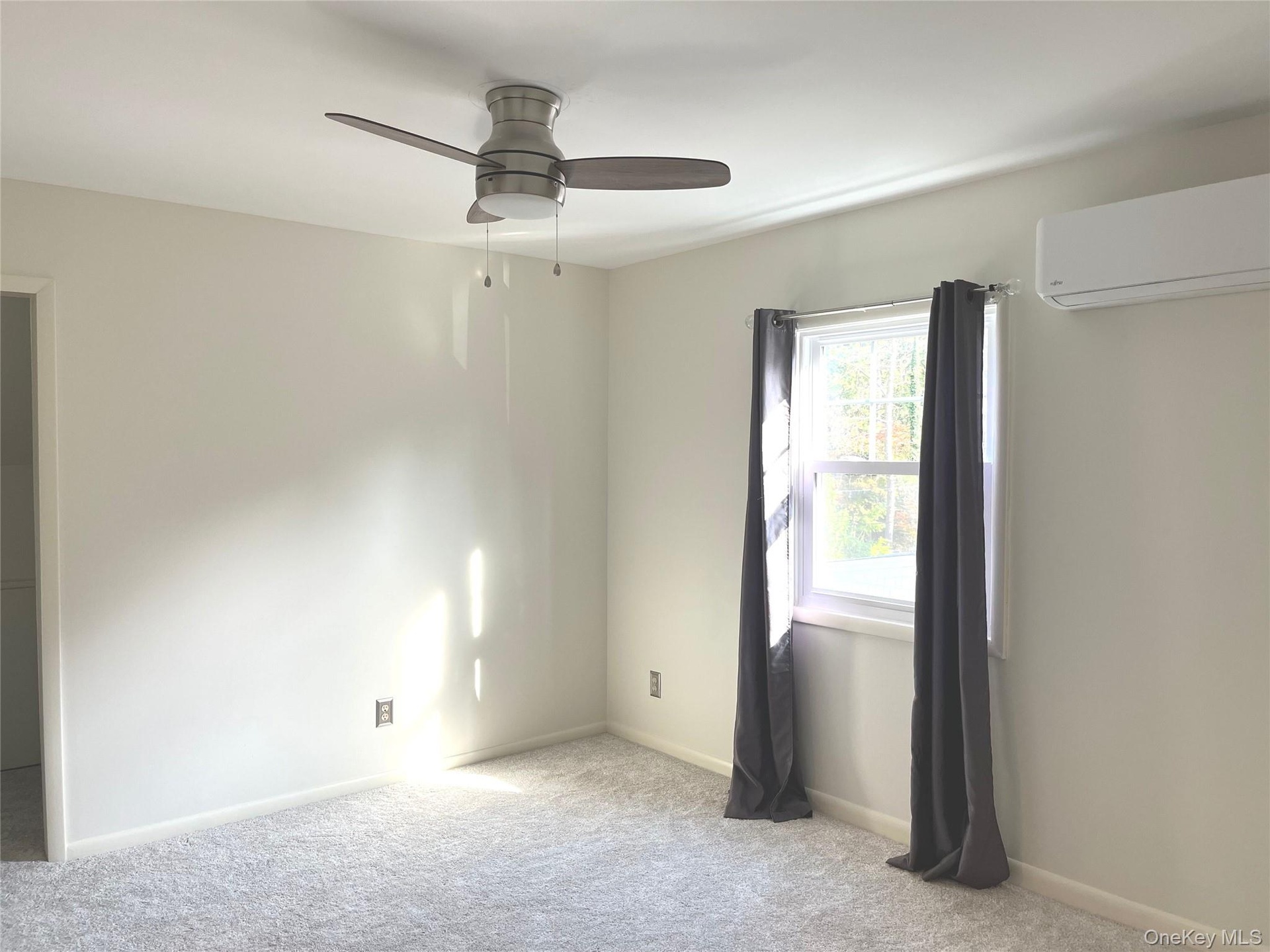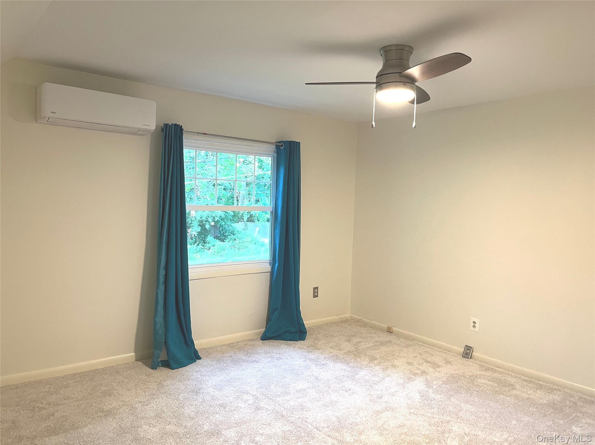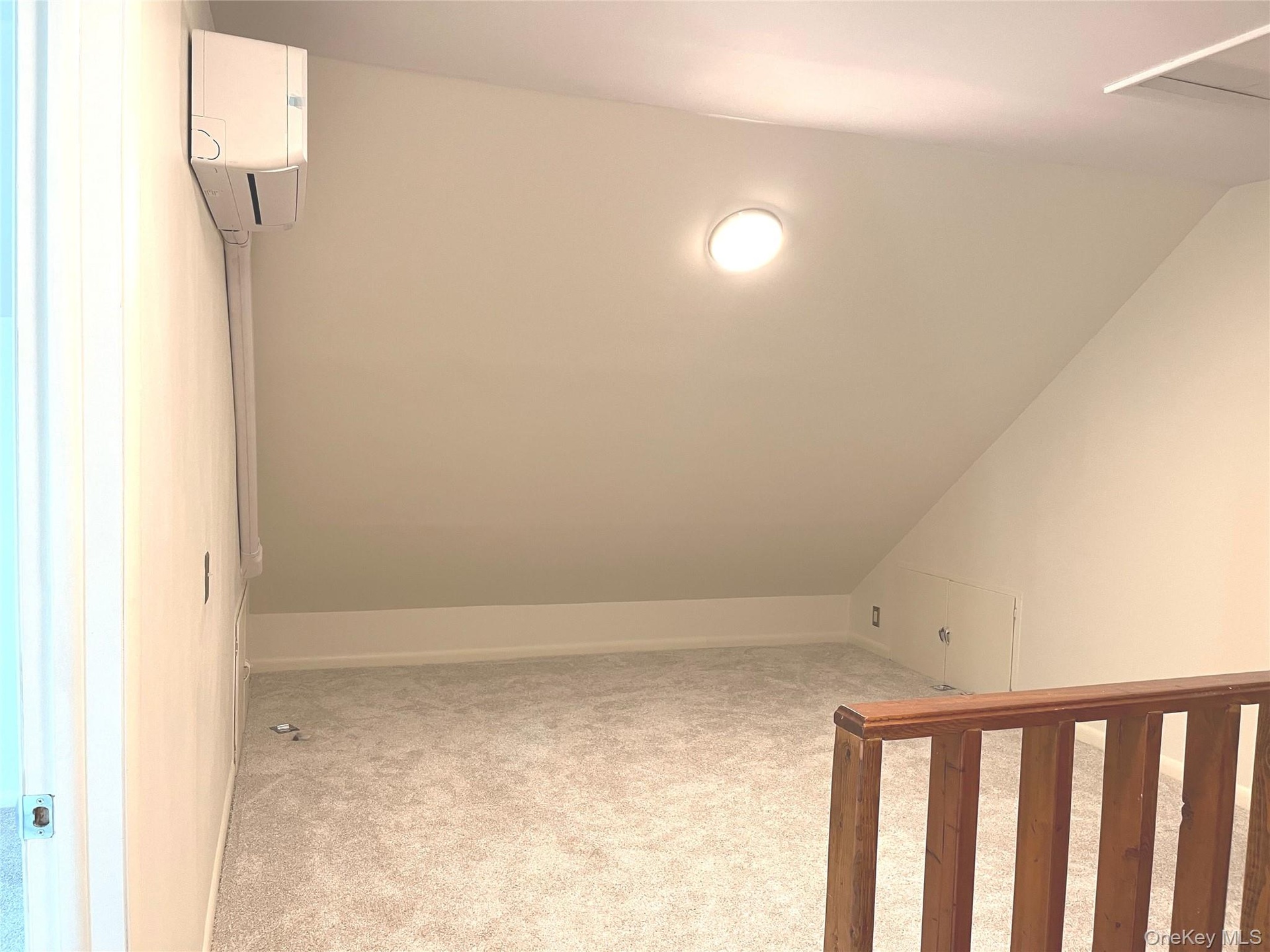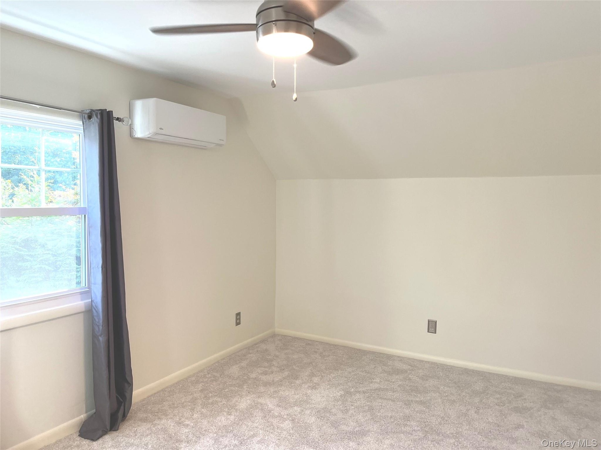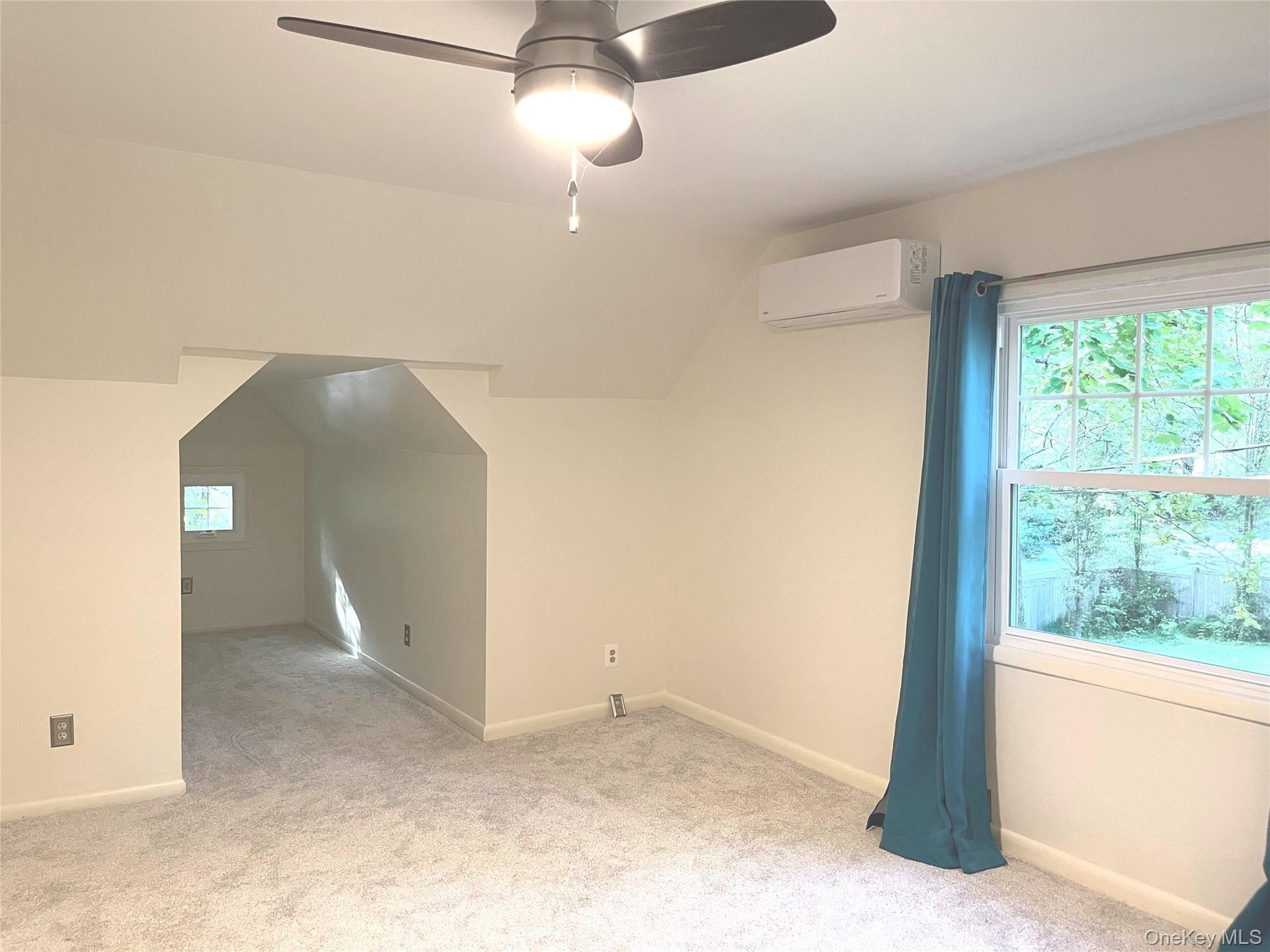 - Additional living space featuring light colored carpet, vaulted ceiling, ceiling fan, and a wall mounted air conditioner